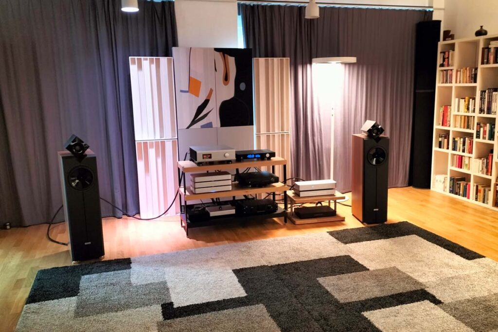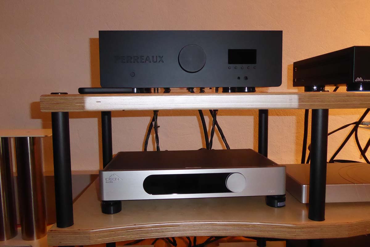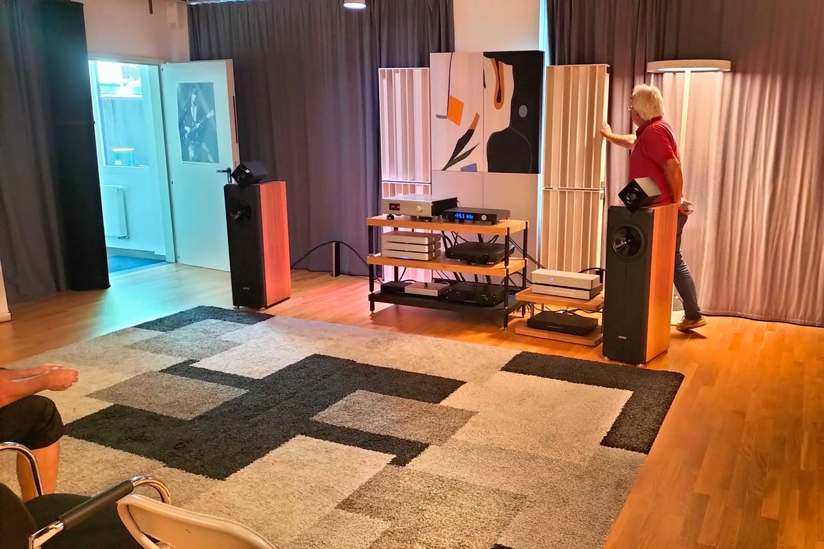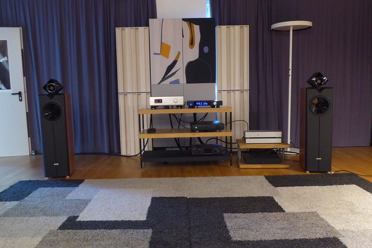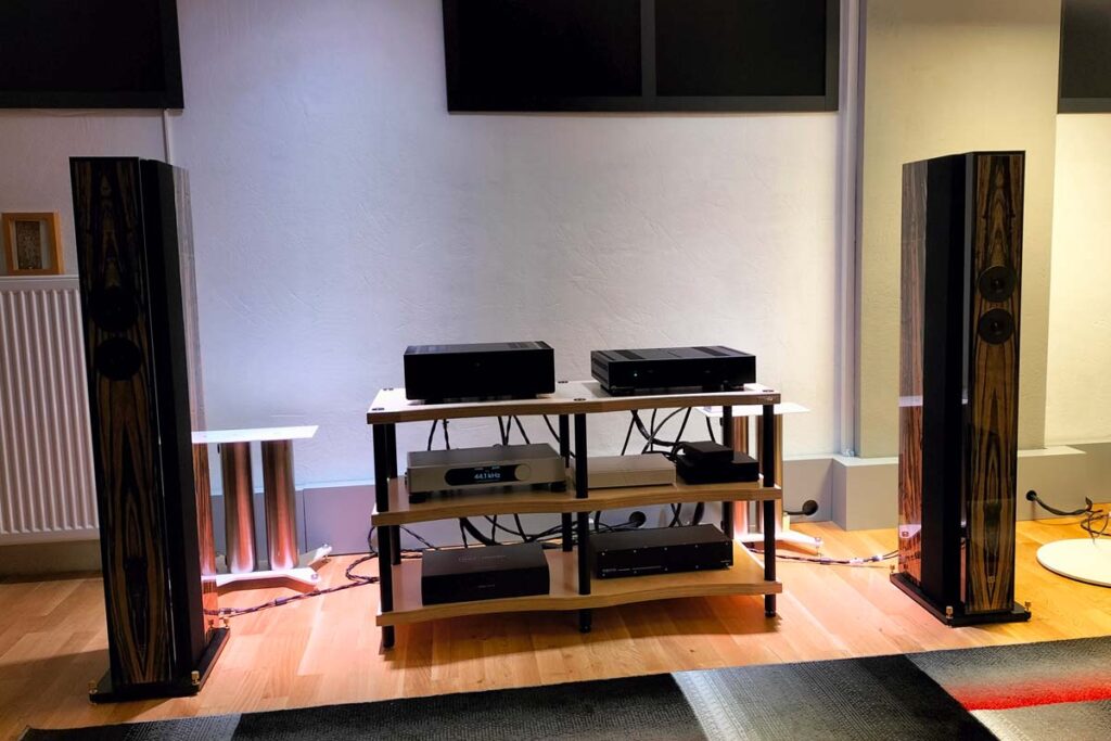Das zweite, weniger umfangreiche Setup im kleineren Annex des Vorführraums zeichnete sich durch eine intimere, aber nicht minder reizvolle Klangästhetik aus. Die schlanken, überaus eleganten Standlautsprecher von Brodmann Acoustics – Modell Vienna Classic VC7 in der White-Ebony-Ausführung – klangen sehr detailliert, räumlich und ausgewogen am Perreaux-Vollverstärker 300iX. Interessant war der Vergleich des internen DACs mit dem alternativ angeschlossenen Ideon ION DAC. Die Unterschiede waren geringer, als der Preisunterschied vermuten ließ.