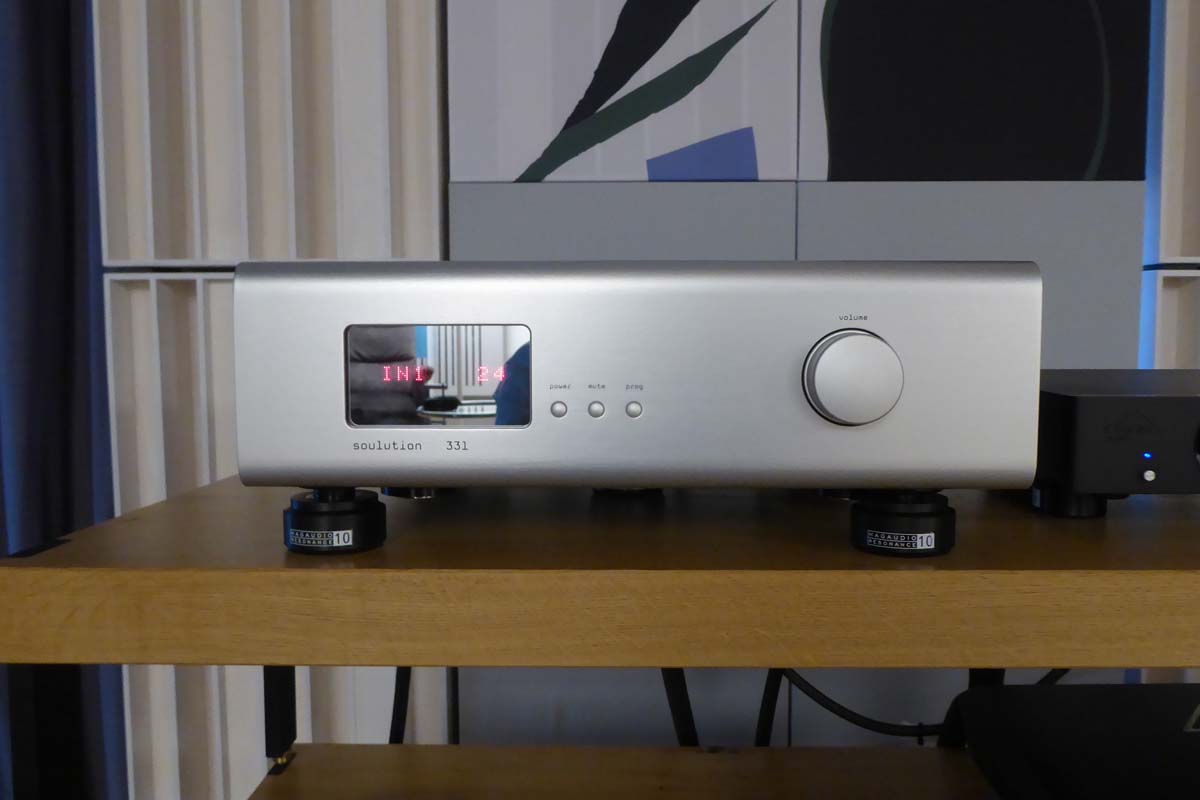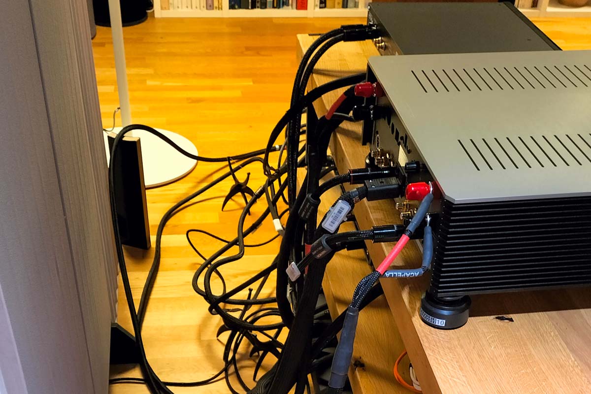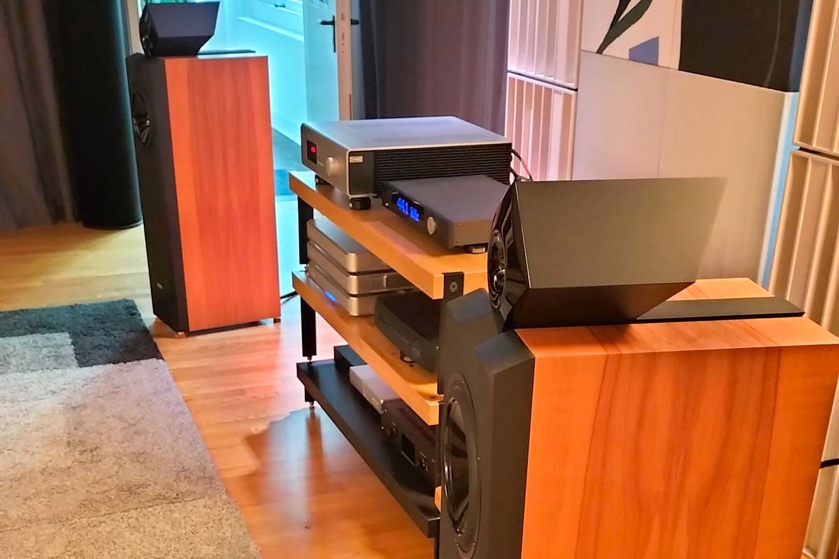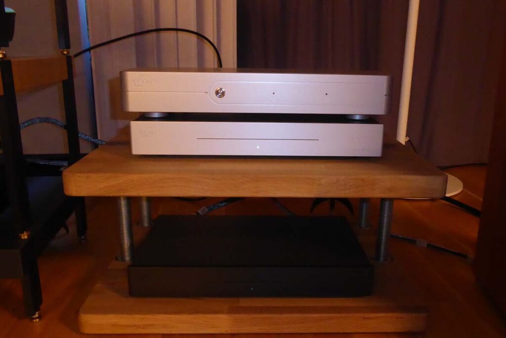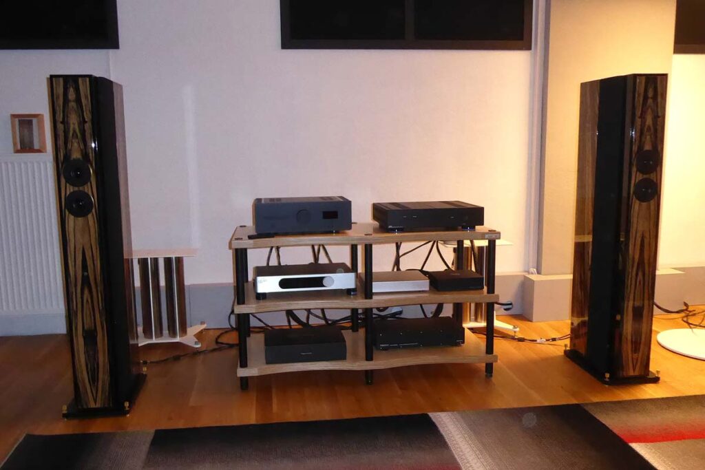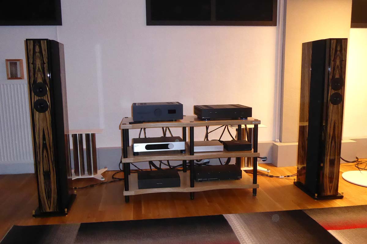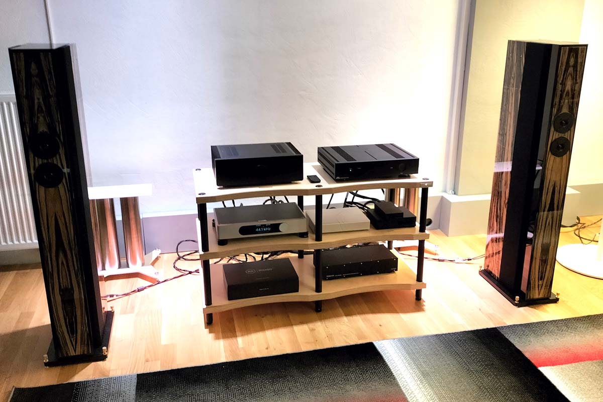 Die Hauptdarsteller des ersten Setups waren Acapellas Harlekin 2, Zweiwege-Standlautsprecher, in einer wunderschönen Birnenholzfurnier-Ausführung. Sie wurden von Soulutions „kleinem“ Vollverstärker 331 angetrieben. Die Lautsprecherkabel, Prototypen und ebenfalls von Acapella, sorgten für störungsfreien Signalfluss. Die Musik wurde von einer sensationell aufwendigen Streamingkette geliefert, deren Hauptakteure der Musikserver Antipodes Oladra G4 und der DAC Ideon EOS waren. Um optimale Arbeitsbedingungen bereitzustellen, wurden sie von einer Armada an Filtern, Switches, Clocks und Netzteilen versorgt. Die digitale Kabellage war von höchster Qualität, um die Anlage nicht durch ein Nadelöhr auszubremsen. Den Strom erhielten die Komponenten mit Ausnahme des Vollverstärkers über den Gordian-Stromfilter von LAB 12. Fast alle Geräte ruhten auf MagAudio-Füßen, die die Performance perfektionierten. Racks von beaudioful (so wie dieses hier) und Creaktiv sorgten für soliden Stand.