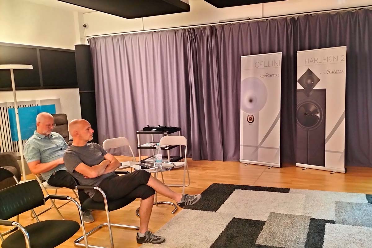 Ich geriet rein zufällig in die Vorbereitung des Events. Als ich das Ladenlokal betrat, waren Torsten Fink, Richard Rudolph und Frank Hakopians, Letztere von der Duisburger High-End-Lautsprechermanufaktur Acapella, gerade dabei, die Kette für das Event abzustimmen. Spontan luden sie mich ein, die Auswahl der Lautsprecherkabel zu begleiten. Es folgten ausgiebige Hörvergleiche, die recht deutliche Unterschiede zutage förderten. Schwieriger gestaltete sich die Beurteilung, da wir durchaus sehr unterschiedlicher Meinung waren. Die Kette spielte mit jedem zur Auswahl stehenden Kabel auf hohem Niveau – und so ging es (wie beinahe immer) um reine Geschmacksfragen. Die Harlekin 2 flutete den ca. 90 Quadratmeter großen Raum vollkommen souverän mit feinsten Klängen. Auf den neu entwickelten Hochtöner ist Rudolph besonders stolz. Dank seiner 45-Millimeter-Polymermembran mit Hornvorsatz musizierte er mit dem 10-Zoll-Tiefmitteltöner, dessen Papiermembran mit einer speziellen Beschichtung versehen ist, wie aus einem Guss.