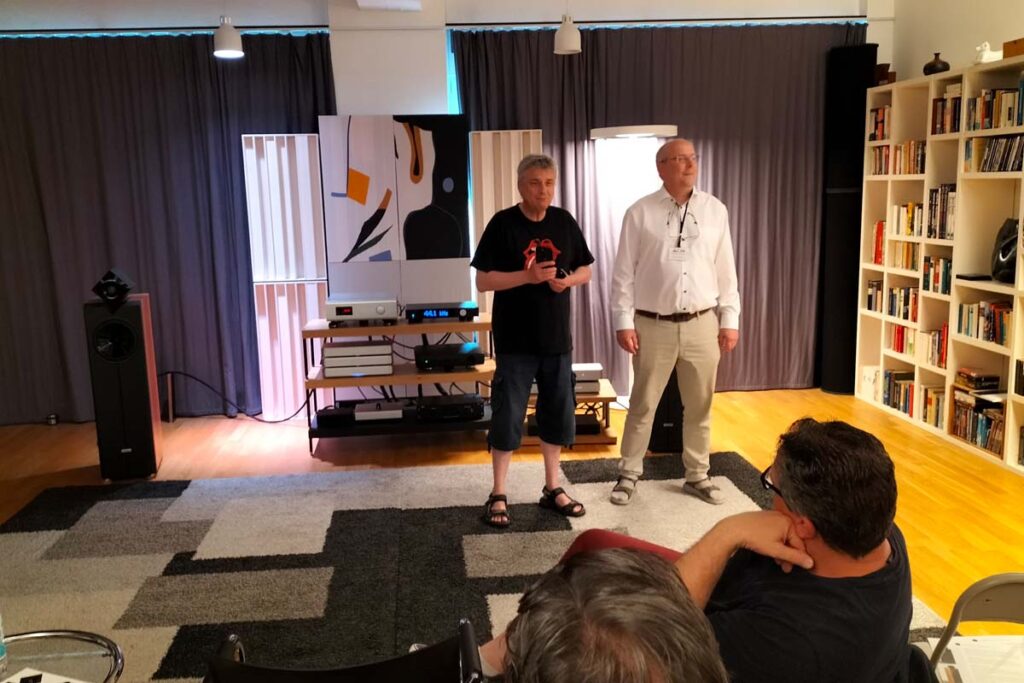 Anlass war die Einführung neuer Produkte ins Portfolio des Händlers, der nebenbei auch als HiFi-Vertrieb aktiv ist. Wie es sich gehört, gab es zu Beginn der Veranstaltung eine kurze Einführung von Torsten Fink (CM-Audio) und Markus Flöter (ACM-Audio). Falls Sie sich über die zweite Personalie wundern: die beiden Händler aus Neuss und Mönchengladbach kennen sich, verstehen sich und nutzten die Gelegenheit, den versammelten Gästen zu erklären, dass sie trotz der Namensähnlichkeiten und der Überschneidungen in ihren Portfolios völlig unabhängig agieren. Im Verlauf der Einführung klärte sich auf, dass es um keine spezifische Neuheit ging. Die beiden vorführbereiten Anlagen bestanden praktisch lückenlos aus Messeneuheiten, Prototypen und ähnlichen „things to come“.
