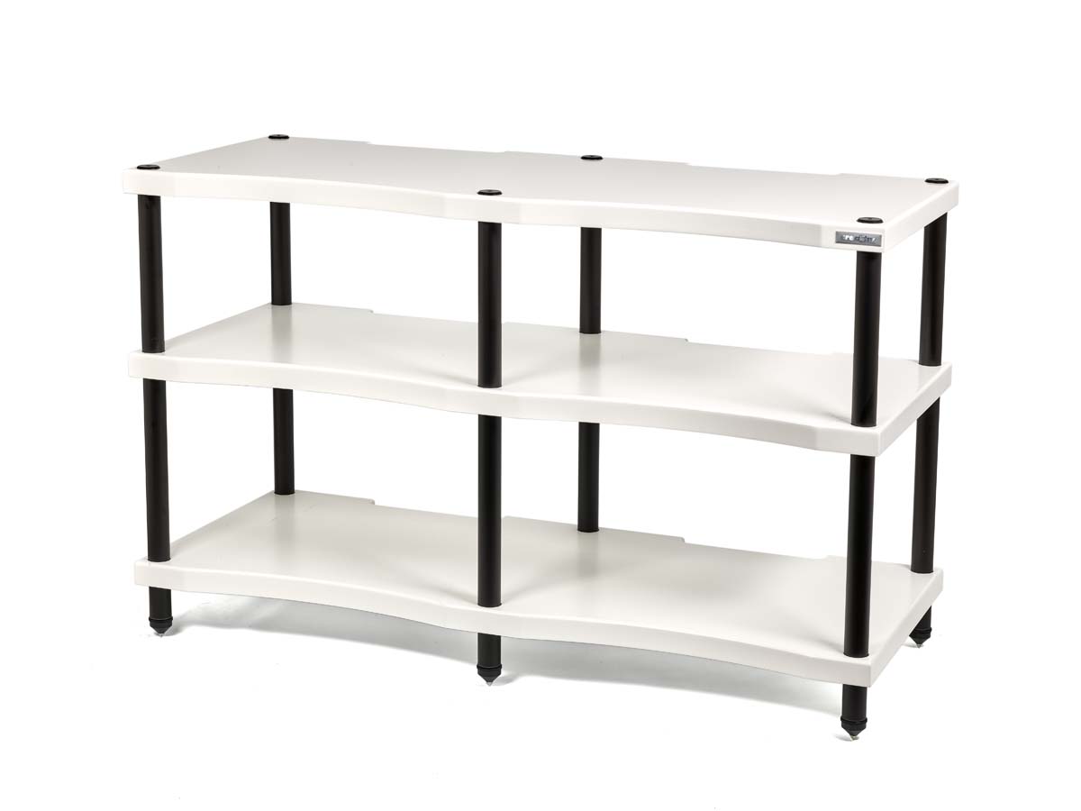 Der Hersteller, beheimatet im nordrhein-westfälischen Bad Honnef, lässt seine „Medienmöbel“ konsequent in Deutschland entwickeln und herstellen. Die Elemente innerhalb einer Baureihe – bei uns eben „Little Reference“ – sind modular und lassen sich nach Belieben kombinieren. So kann man sich ein maßgeschneidertes Rack kombinieren, das den Ansprüchen der Kette entspricht. Da die Ebenen über robuste 35-Millimeter-Alu-Rohre fest miteinander verschraubt werden, die in verschiedenen Längen lieferbar sind (auf Nachfrage auch Sondermaße bis 400 mm), lassen sich auch asymmetrische oder kunstvolle Gebilde realisieren, die im Extremfall eine vollständige Zimmerwand vereinnahmen können. Ergänzend zu den geschwungenen Bögen an der Stirnseite (beim Double sind es natürlich Doppelbögen) gibt es an der Rückseite breite, flache Einkerbungen, die bei der Wandaufstellung als Kabelführungen dienen. Außer wenn massivste Stromkabel Verwendung finden, kann man die Anlage also umverdrahten, ohne das Rack von der Wand abrücken zu müssen. Für perfekten Stand ruhen die rheinischen HiFi-Möbel auf höhenverstellbaren Füßen. Bei den sechs „Beinen“ unserer Double-Variante war die Justage vergleichsweise knifflig, ging mit einer Libellen-Wasserwaage allerdings gut von der Hand. Letzte Unebenheiten tilgt das Rack ohnehin von selbst, da es sich mit seinem erstaunlichen hohen Gewicht (zuzüglich Komponenten) fest auf den Boden presst. Denen, die lieber „in den Boden bohren“, liefert der Hersteller optional auch Spikes, die auf den feschen Namen „Bodenkegel“ hören. Für mehr Mobilität sorgen optionale Bodenrollen-Sets.