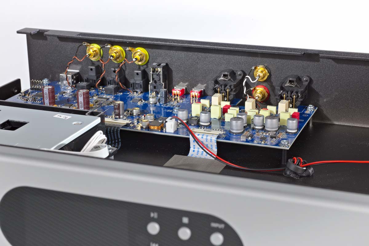 Die Gehäusekanten des Players sind sauber abgerundet, die Stahlbleche kaum sichtbar mit versenkten Torx-Schrauben befestigt. Auf der Rückseite sind sämtliche Anschlüsse, zwei Schalter zur Aktivierung der integrierten Lautstärkeregelung und Auto-Standby-Funktion sowie der harte Netzschalter untergebracht. Alle Buchsen machen einen hochwertigen Eindruck und sind mit dem Stahlblech verschraubt. Der Player steht auf vier soliden Füßen mit weich federnden Gummieinlagen, die den Player weitgehend vom Untergrund entkoppeln. Anscheinend hat der Sparfuchs hier an keiner Stelle sein Unwesen getrieben.