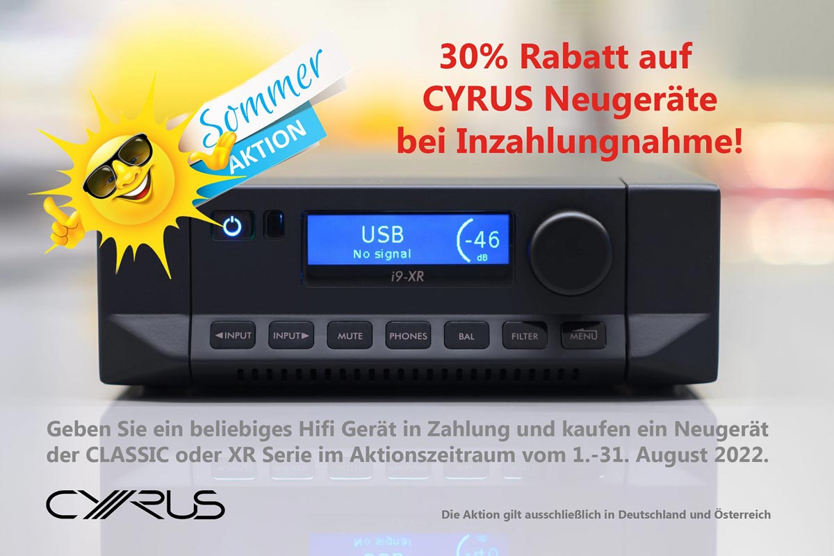 Vom 1.-31. August bietet der Cyrus-Vertrieb für Deutschland und Österreich im Rahmen einer Sommeraktion eine 30% Aktion bei Neukauf eines Cyrus-Gerätes aus der „Classic“ oder „XR Serie“.