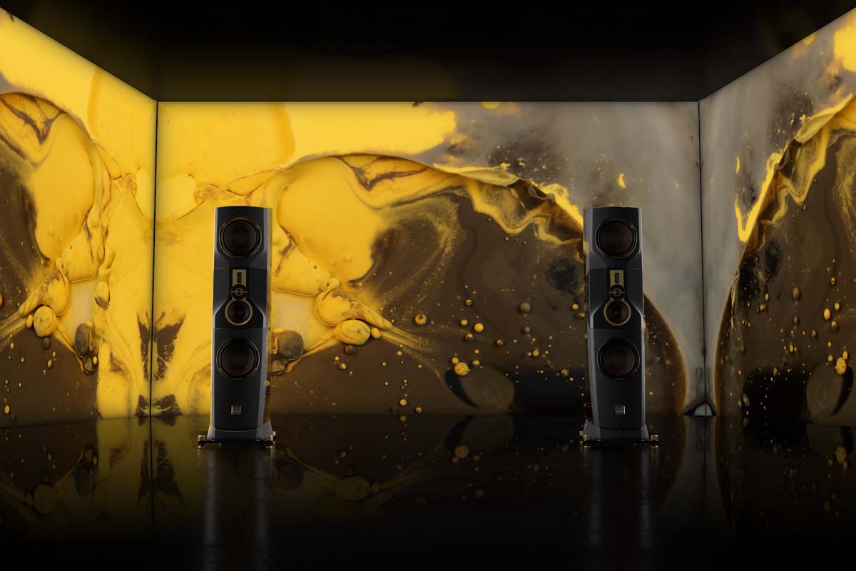 Hier kommt Kore ins Spiel. Sie ist eine Botschafterin, die neue Technologien wie den überirdisch feinsinnigen Neo-K-Hybrid-Tweeter einführt, Fertigungsstandards definiert und für maximale Aufmerksamkeit sorgen soll. Letzteres fällt der gewichtigen Dänin leicht. Selbst in unserem großen Hörraum (42 m2) wirkte sie titanisch. Statt der momentan angesagten Aufreihung vieler mittelgroßer Treiber setzten ihre Entwickler auf lediglich zwei 30-Zentimeter-Bässe voller Superlative: Die Magnetringe hinter den versteiften SMC-Membranen nehmen beinahe den gesamten Durchmesser der Treiber ein, die zugehörigen Spulenträger sind derart lang, dass sie zwei Zentrierringe erfordern. Solche Kraftpakete benötigen Raum. Mit über 50 Zentimeter Breite wirken die Boxen alles andere als dezent – und das sollen sie wohl auch nicht sein. Ihre bullige Erscheinung, das vorzügliche Furnier, ausladende 35-Kilo-Metallfüße mit fetten Spikes sowie goldene Intarsien um die völlig neu aufgebauten Mittel- und Hochtöner schreien geradezu: „Platz da, hier komme ich!“