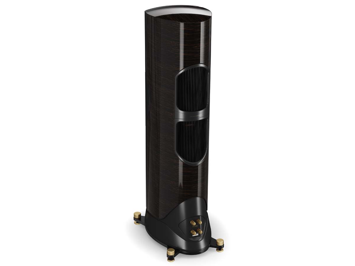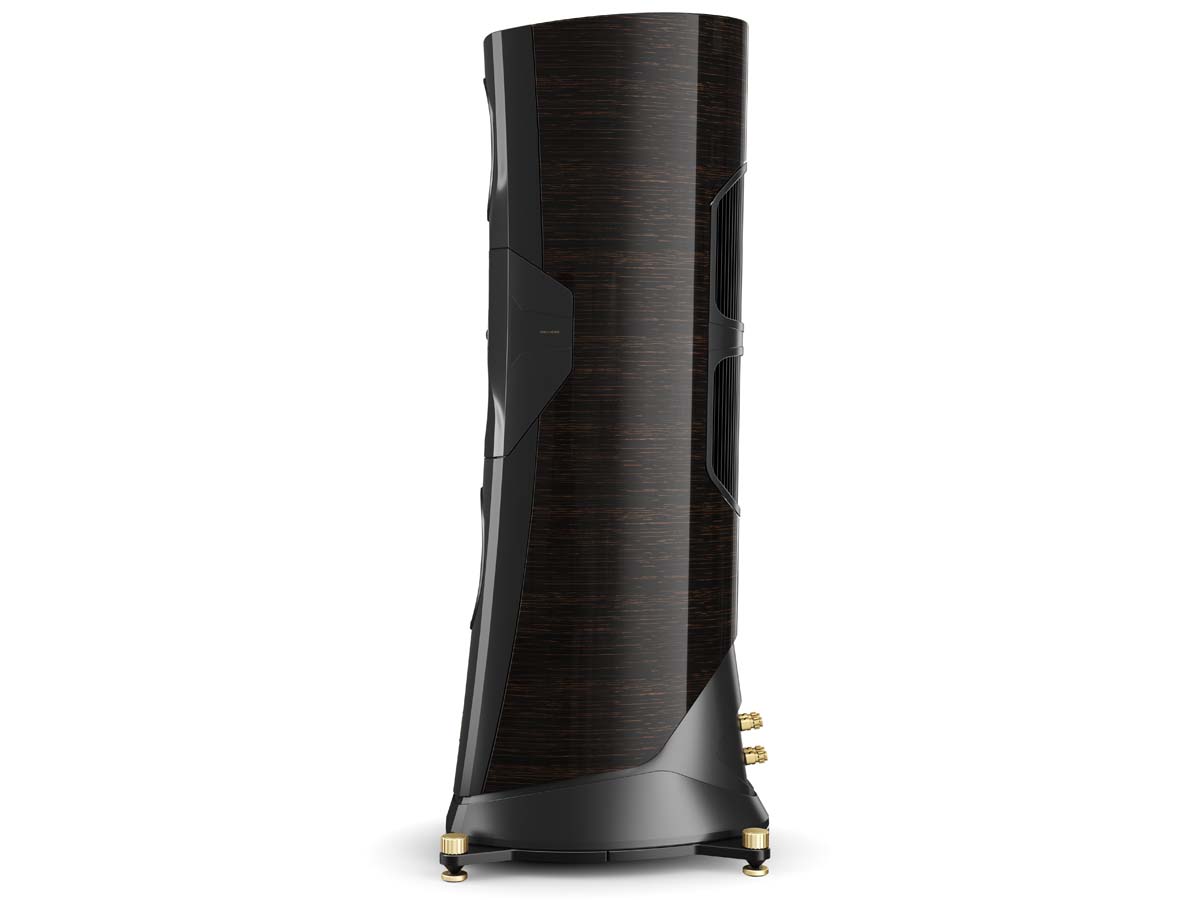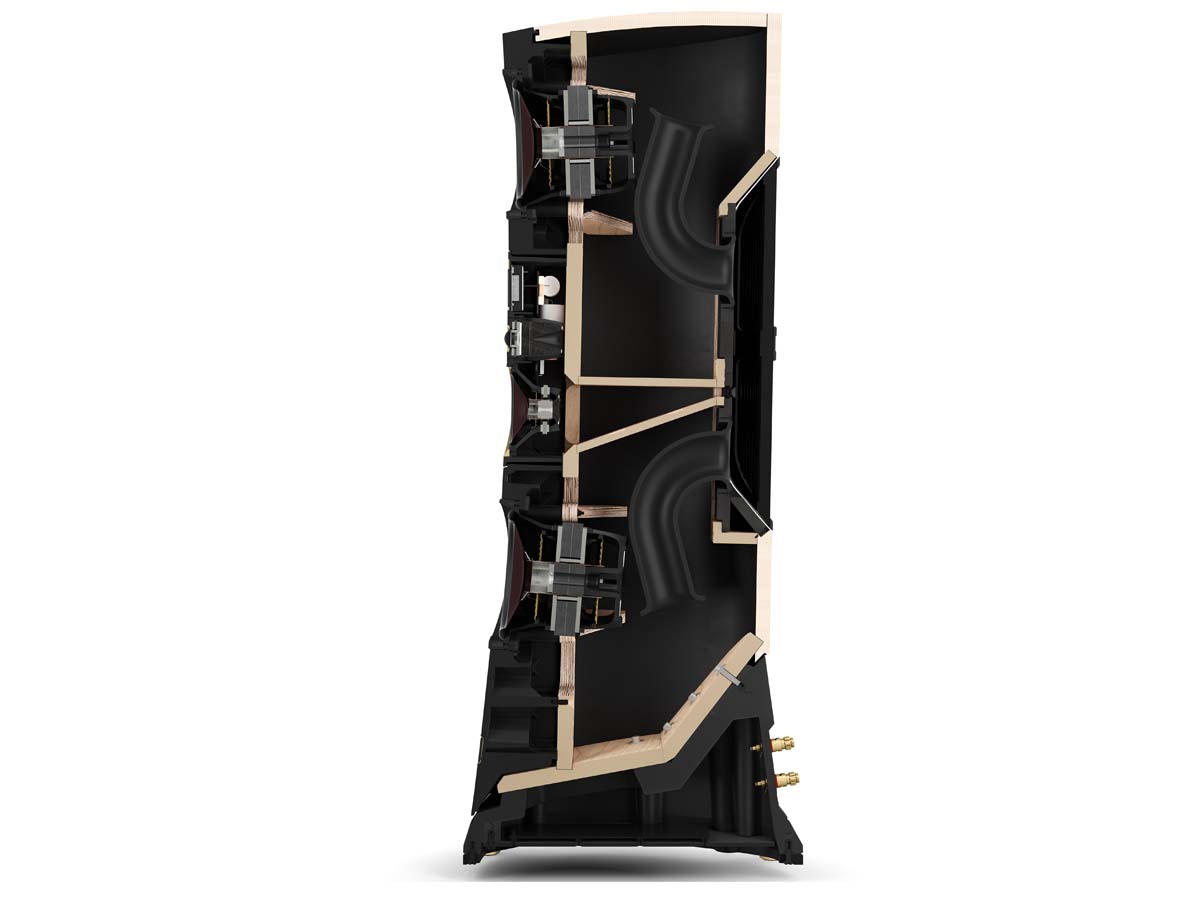 Das sowohl optisch wie technisch einzigartige Gehäuse der DALI KORE besteht aus einem geschwungenen Holzlaminat mit glänzendem Amara-Ebenholzfurnier. Für die Hoch- und Mitteltöner kommt eine aus Aluminiumdruckguss gefertigte Schallwand zum Einsatz und ein 34 kg schwerer Sockel aus zementbasiertem Harzverbundstoff bildet die solide Grundlage für das beträchtliche Gesamtgewicht des Lautsprechers von über 150 kg.