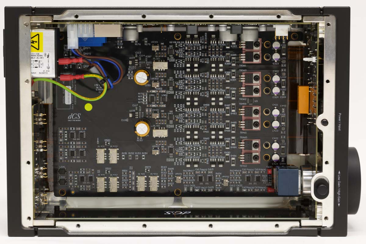 Dass er mit seinen Eingängen für 6,3-mm-Klinken-XLR sowie einem vierpoligen symmetrischen Eingang schon von Weitem seinen Kontaktwillen mit jeder Art von Kopfhörer anzeigt, ist keine bloße Äußerlichkeit. Das Schaltungsdesign, das im dCS-Lingo als „Class Super AB“ betitelt wird, ist mit besonderem Blick für die riesige Bandbreite an Impedanzen entwickelt worden, die unter Kopfhörern vorherrscht. Dabei gehen die dCS-Entwickler grundsätzlich davon aus, dass die Maximalleistung in Watt bei Kopfhörern nur eine geringe Aussagekraft hat – vielmehr kommt es darauf an, besonders hochohmige Kopfhörer mühelos mit genügend Spannung versorgen zu können, wohingegen bei Modellen mit besonders niedriger Impedanz vor allem Stromlieferfähigkeit gegeben sein muss. Realisiert wird das mit einem High-Bias-Class-AB-Design, bei dem der Ruhestrom mit einer besonderen Schaltung gesteuert wird, die die Verzerrungen im Übergang vom Class-A- zum Class-B-Zustand in Schach halten soll – wenn es denn mal dazu kommt, denn in den allermeisten Anwendungsfällen bleibt die Schaltung dem Vernehmen nach im reinen Class-A-Betrieb. Die Leutchen bei dCS haben dabei genug Vertrauen in die Leistungsfähigkeit des Verstärkers, dass sie in ihrem Marketingmaterial als potenzielle Spielpartner explizit berüchtigte Größen wie den Abyss Diana oder den HiFiman Susvara nennen – wenn ein Verstärker die antreiben kann, dann wird er mit jedem Kopfhörer klarkommen.