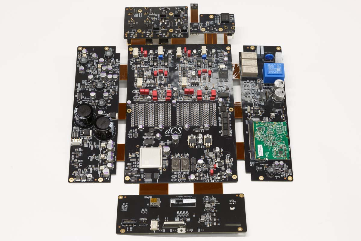 Herzstück des Systems ist wie bei dCS üblich der einzigartige Ring-DAC, der oberflächlich einem Ladder-DAC ähnelt, aber bei der Wandlung einen ziemlich genialen Sonderweg geht. Das Problem mit Ladder-DACs ist bekanntermaßen die Bauteilkonstanz – da jedes der Bits doppelt so laut ist wie das vorhergehende, müssen sich die Kennwerte der Bauteile im Grunde innerhalb unrealistisch enger Toleranzen bewegen: Weicht beispielsweise der Widerstandswert am Most Signifikant Bit um nur ein Prozent vom Soll ab, hat allein die Pegelabweichung einen höheren Betrag als das gesamte siebte Bit. Hierfür haben sich die Tüftler hinter dCS eine ziemlich ausgefuchste Lösung einfallen lassen. Zunächst haben sie als Wurzel des Problems die Tatsache identifiziert, dass jedes Bit seine eigene Stromquelle besitzt und dementsprechend jedes Mal, wenn es aktiviert wird, den gleichen Fehler ins Signal speist und so hörbare lineare Verzerrungen verursacht.