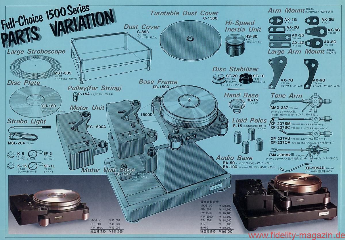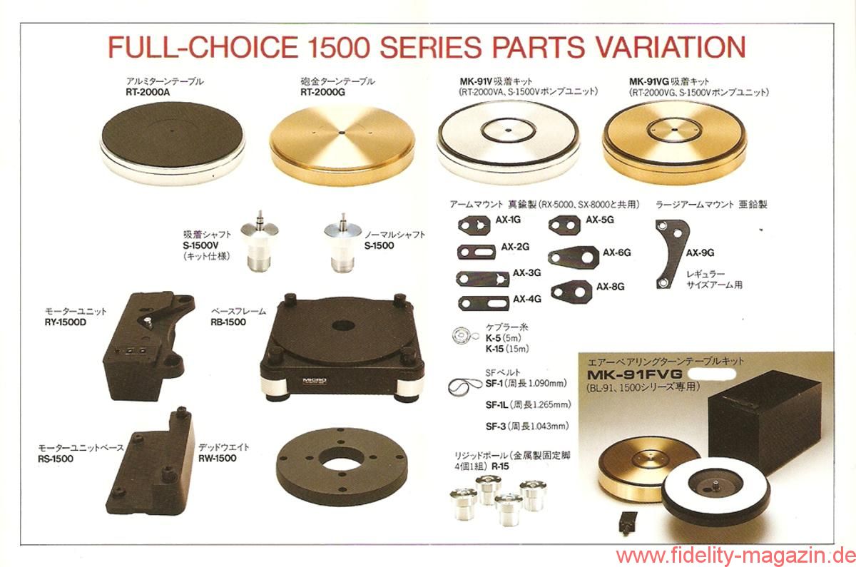 Separat erhältliches Zubehör zur Erweiterung des nackten Laufwerks bietet Micro Seiki in den 1980ern reichlich an. Als beliebt erweist sich vor allem die Option, den geregelten Gleichstrommotor (RY-1500A oder RY-1500D) im recht schweren Motorstand RS-1500 aufzustellen. Die separate Aufstellung bringt neben der mechanischen Entkopplung des Antriebs vom Laufwerk und der Reduktion von Einstreuungen auf den/die Tonabnehmer noch weitere Vorteile: So können am eigentlichen Chassis nun bis zu vier Tonarmbasen montiert werden, und der 40 Millimeter dicke, aber nur 2,8 Kilogramm schwere Plattenteller aus Aluminium-Spritzguss lässt sich mit dem String K-5 betreiben.