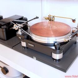 Eine Tellerauflage aus Gummi lässt sich gegen die Kupfermatte CU-180 austauschen, die Micro Seiki im Laufe der Jahre merkwürdigerweise in „Gun Metal Turntable Mat“ umtaufte. Diese rund 1,8 Kilo schwere Kupferscheibe erhöht nicht nur die Laufruhe und das Trägheitsmoment des Tellers, sie verbessert auch die klangliche Performance des aufliegenden Tonträgers. Und sie ist, Sie ahnen es, extrem selten zu finden.