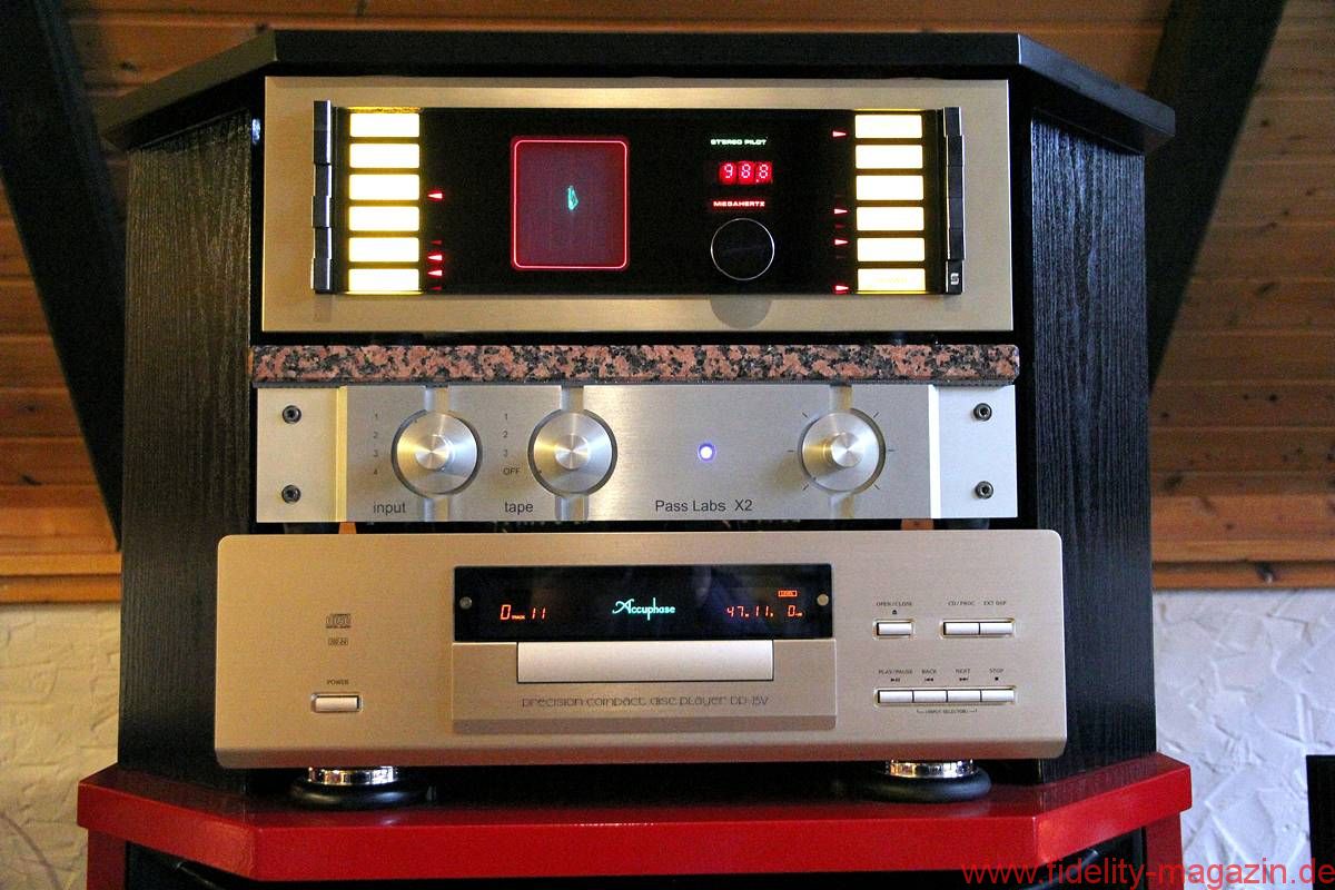 Die beeindruckende Schallwandlerparade ist von einer Auswahl muskulöser Endstufen durchsetzt, etwa einem Pärchen Threshold S/A1 und einer Accuphase P-800, doch Herr F. hält noch etliche Schätzchen in der Hinterhand. An zentraler Stelle im eigenen Gehäuseaufsatz stapeln sich Accuphase DP-75V, Pass X2 und besagter Sequerra FM-1. Noch ist zwar keine Musik zu hören, trotzdem ist auf dem markanten Bildschirm des Empfängers schon „was los“. Die Bildröhre des eingebauten Oszillografen stellt die Signalstärken aller hereinkommenden Sende- und Störfrequenzen analog und anschaulich dar – ein Hingucker und Helferlein zugleich. Mit diesem exklusiven Feature, das schon den Marantz 10B über alle anderen Tuner seiner Ära erhob, gelingt die optimale Ausrichtung einer Rotorantenne auf den gewünschten Sender im Handumdrehen. Da ohne ordentliche Antenne selbst der allerbeste Tuner nix taugt, sorgt eine 8-Element-Rotorantenne auf dem Dach für bestmögliche Versorgung. Entsprechend gute Programm- und Sendequalität stellen heute aber nur noch ausgesuchte Kultursender zur Verfügung. Derart versorgt, so schwört Herr F., sei der Klang eines superben UKW-Tuners dann auch durch nichts mehr zu toppen. Also habe es sich auch gelohnt, alle Kondensatoren des Sequerra durch Originale aus den USA zu ersetzen.