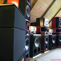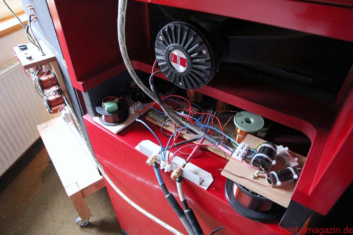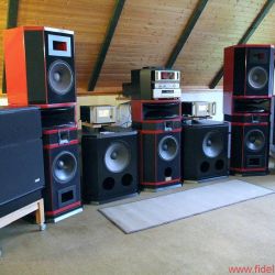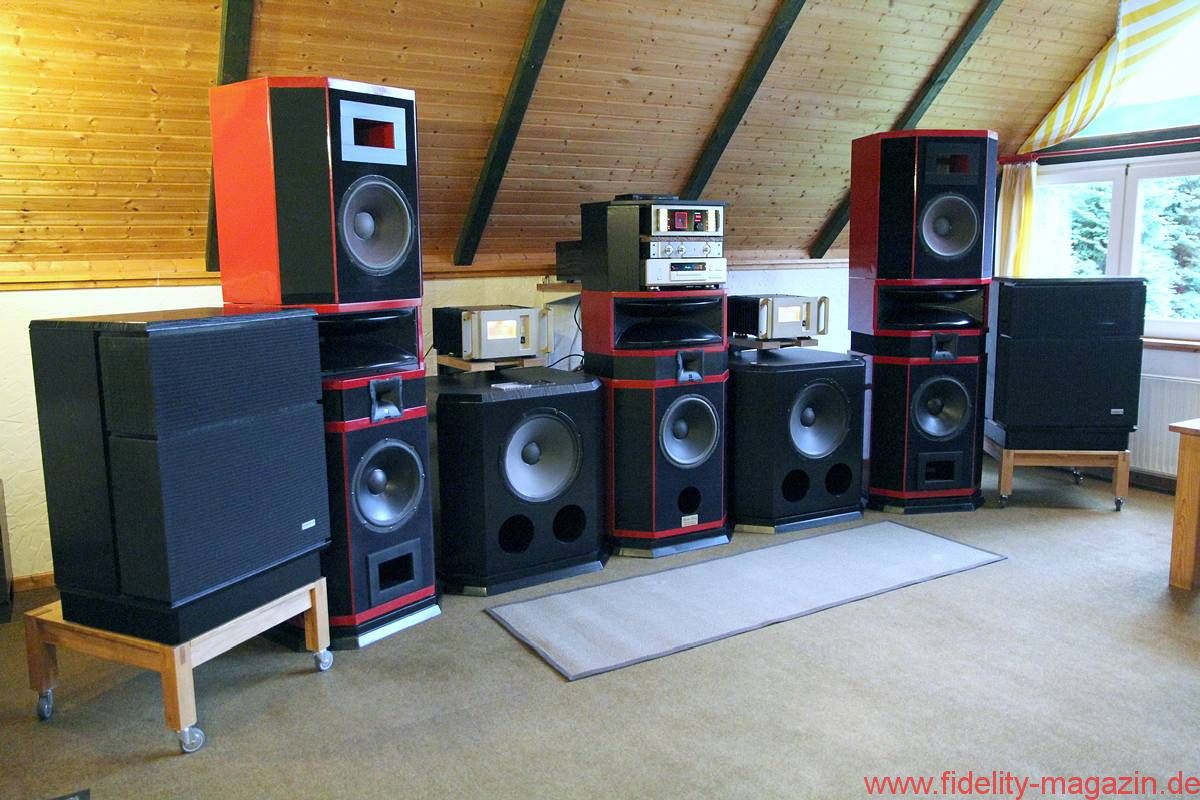 Derweil bestaune ich die in definierter Kurvatur über die gesamte Längsseite des Wohnzimmers aufgebaute Lautsprecher-Skyline. Sie basiert im Wesentlichen auf Variationen und Verfeinerungen der Electro-Voice Sentry III, einem populären Horn-Hybridkonzept aus den 1970ern. Das erste Pärchen kaufte Herr F. 1978 für 7200 Mark; vor kurzem wurde es wieder integriert, um das System auf fünf Kanäle zu erweitern.