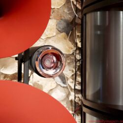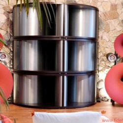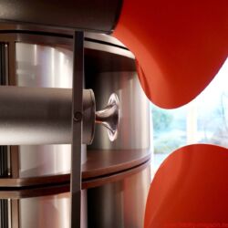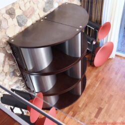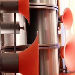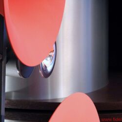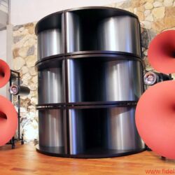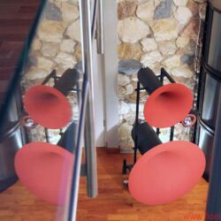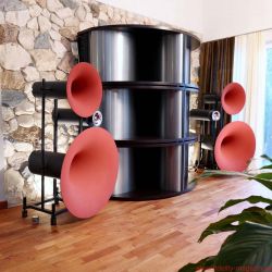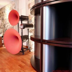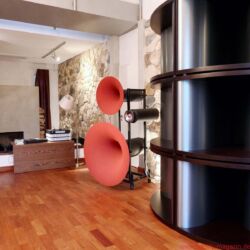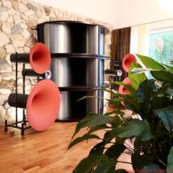 Herr A. hat sich zwischenzeitlich seinen Traum erfüllt und ein Haus gebaut, das sich quasi um ein Pärchen Avantgarde Acoustic Trio – in Nextel-Mattlack „Stealth Nocturne Red“ mit goldenen Hochtonhörnern – herumschmiegt, wenn man das so sagen darf. Und aus dem „eigentlich ausreichenden“ Basshorn-Doppelpack der ersten Stunde ist erst ein flotter Vierer, dann ein fast schon monolithischer Sixpack geworden. Vor allem in der höchsten Ausbaustufe wirkt das komplette, nunmehr zwölfteilige Trio-Ensemble wie ein riesiges Kunstwerk im Raum, das sich mühelos in das geschmackvoll arrangierte Ambiente des Wohnhauses einfügt. Schön, dass die Skulptur auf Knopfdruck auch noch Musik machen kann – und wie! Zum Dahinschmelzen. Zum Aufspringen. Zum Abrocken. Zum Versinken.