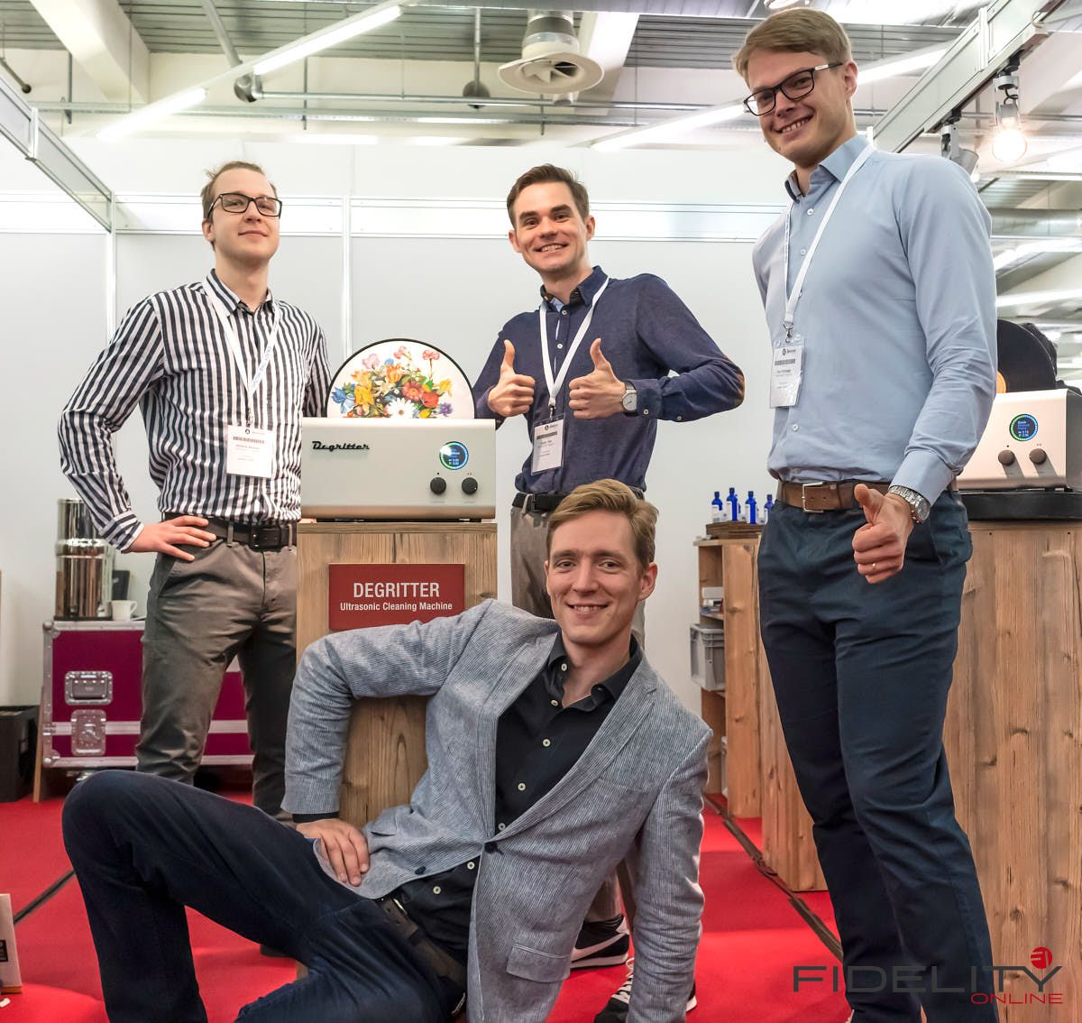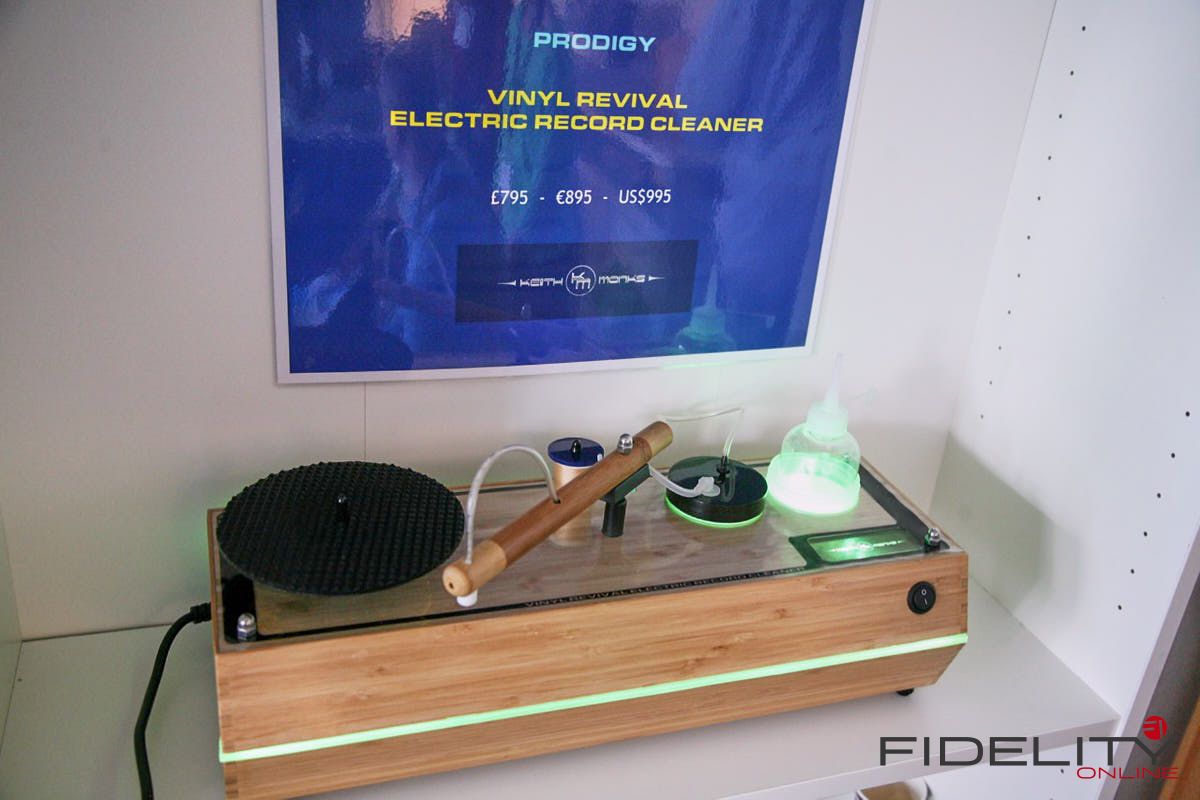 Ebenfalls bei Live Act Audio erspähten wir die wohl derzeit fortschrittlichste, vor allem aber leiseste Plattenwaschmaschine überhaupt. Eine Ultraschallwaschmaschine von Breu, die auch mit Flüssigkeit, und oder Bürste in beliebigen Kombinationen dem Staub in der Rille den Garaus macht. Getrocknet wird nicht durch absaugen, was diese Maschinen immer mehr oder weniger laut werden lässt, sondern durch simple Rotation. Die gereinigte Platte wird “einfach” auf eine ordentliche Drehzahl gebracht und dadurch die Restfeucht weggeschleudert. Der Clou: Zum Reinigen fahrt die Platte von oben mit einem Lift in die Maschine hinein – und am Ende des Waschvorganges natürlich auch wieder raus.