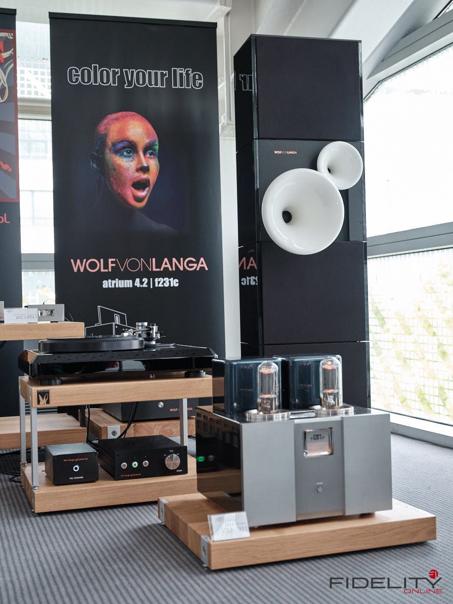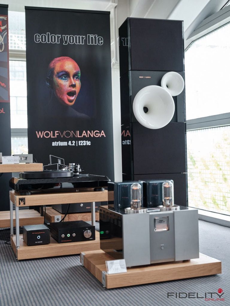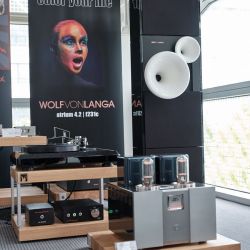 Nur wenige Räume weiter zog mich – und ich muss es wirklich so sagen – eine Kette in ihren Bann. Ein Röhren-Frontend von Air Tight in Verbindung mit Lautsprechern von Wolf von Langa. Der Name des Lautsprechers: Berlin. Die Berlin besteht aus drei fremderregten Basslautsprechern in offenen Gehäusen, die zusammen mit zwei Druckkammertreibern und Hornvorsatz arbeiten. Ein Passivsystem. Es fällt schwer, das gehörte in Worte zu fassen. Vielleicht sollte ich dazu neue Wörter verwenden, die man in diesem Umfeld nicht so häufig hört: Friedvoll, organisch und mächtig treffen es gut. Der Präsentation fehlte jede Spur des technischen oder aggresiven, was bei sehr analytischen Lautsprechern nicht selten anzutreffen ist. Die Berlin präsentierte Musik, anstatt nur Töne. Musik war einfach da, gelöst von den Lautsprechern, holografisch und mit wunderbarer Leichtigkeit. Selbst feinste Details entfalteten sich vor den Zuhörern, ohne dabei überanalytisch zu wirken. Die Darbietung hatte obendrein ein glaubwürdiges Fundament, bei dem niemals die Frage nach dem „Ist das zu weich, oder zu straff, oder geht es vielleicht noch besser?“ aufkam. Ja, ich denke friedvoll, organisch und mächtig, gepaart mit einem Höchstmaß an Glaubwürdigkeit treffen es sehr gut – ein echtes Highlight.