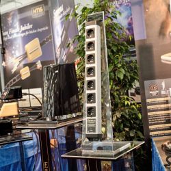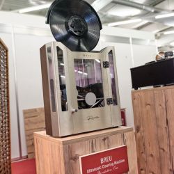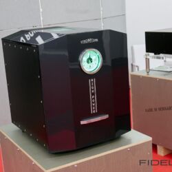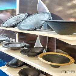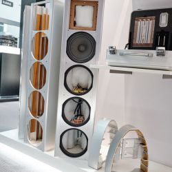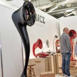 Zu guter Letzt möchten wir auch diesen technologischen Leckerbissen nicht verschweigen. Wieder unten in den Hallen, wieder ein (kleiner) Vorführcontainer. Die Marke: AudioNec aus Frankreich. Bereits vor Jahren war AudioNec mit seinem Lautsprecher „Answer“ in München aufgefallen und war in den Augen vieler Besucher und der Medien, eines der absoluten Highlights der Messe. Das Besondere der AudioNec Lautsprecher ist der einzigartige Lineum-Treiber, der den unglaublichen Frequenzbereich von 200 Hertz bis 20.000 Hz abdecken kann. In diesem Jahr präsentierte man die „Evo Line“, einem modular erweiterbaren Lautsprecherkonzept rund um den legendären Lineum Treiber. Man kann kleine anfangen und Stück für Stück (so wie es der Geldbeutel zulässt) das System erweitern und in immer neue klangliche Sphären aufsteigen. AudioNec Lautsprecher zeichnen sich durch ein beinahe schon ungewohntes Maß an Direktheit und perkussiven Qualitäten aus, die in dieser „Attacke“ eigentlich nur vom live gespielten und nicht von konservierten Instrumenten bekannt sind.