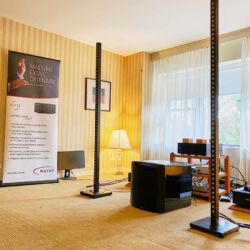 Zu den ungewöhnlichsten zähle sicher der Raum von Sam Laufer und seiner Marke Laufer Teknik. Mr. Laufer war mit einem Lautsprecher namens „The Note“ angereist. The Note ist eine Vollbereichs-Linienquelle (die aber einen Subwoofer braucht), die aussieht, wie eine Stange. Das Besondere: Das Innere des Lautsprechers wird geheizt, um den eingebauten Chassis ein größeres Volumen vorzugaukeln. Eine ungewöhnliche Maßnahme, aber geklungen hat die Box superb. Angetrieben von einem Memory Player und Absolare Elektronik gab es an der holografischen Abbildung wenig zu meckern.
