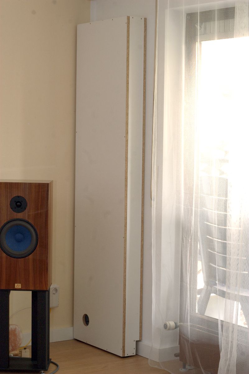 Sobald die Problemfrequenz eingekreist ist, lassen sich wirksame Gegenmaßnahmen ergreifen. Im konkreten Fall soll das ein sogenannter Helmholtzresonator sein – letztlich nichts anderes als eine Bassreflexbox ohne Treiber, die auf eine bestimmte Frequenz abgestimmt ist. Und je größer die Kiste, desto höher ihr Wirkungsgrad; damit muss man sich allerdings abfinden. Um in meinem Raum halbwegs unauffällig ein 110-Liter-Volumen unterzubringen, entschied ich mich für einen sehr flachen und hohen Kasten, den man an die Wand hängen kann. Hinter einer Gardine fällt so ein Ding im Alltag nicht allzu sehr auf.