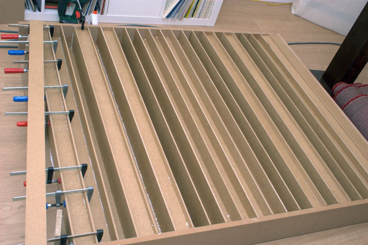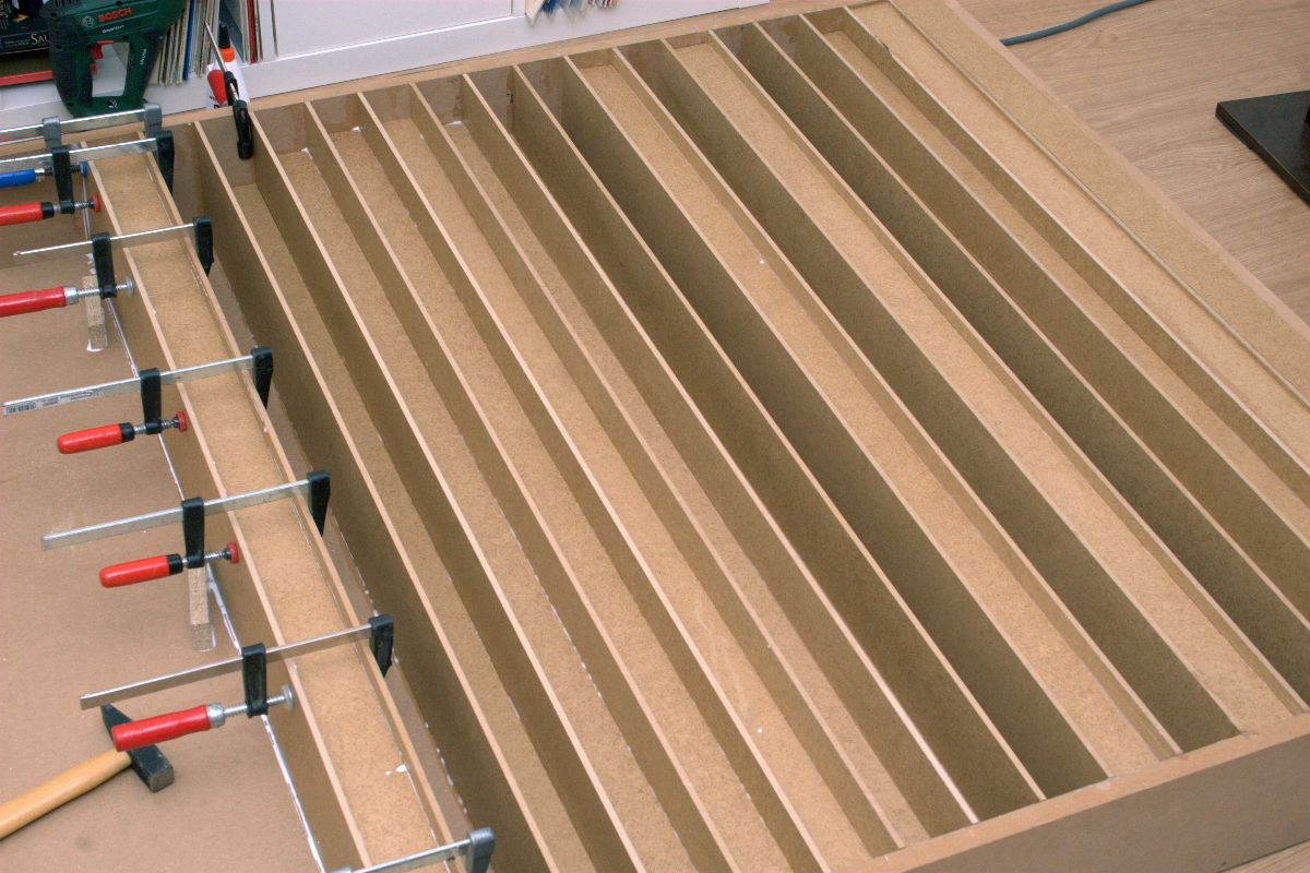 Im Grunde besteht der eindimensionale Diffusor aus mehreren nebeneinander liegenden Kammern gleicher Breite, aber unterschiedlicher Tiefe. Die Breite definiert die obere, die Tiefe der tiefsten Kammer die untere Wirkungsgrenze. So angeordnet, streut der Diffusor den Schall in horizontaler Ebene, was bei entsprechender Aufstellung genügen kann. Um herauszufinden, welche Kammer wie tief sein soll, begeben wir uns entweder auf das nicht jedem geläufige Feld der Stochastik, oder wir bemühen einen der vielen Online-Rechner, etwa www.mh-audio.nl/Diffusor.asp. Zur Mathematik nur so viel: Anhand von Primzahlenketten wird eine Verteilung ermittelt, die letztlich ihre klangliche Entsprechung in weißem Rauschen findet. Mein Diffusor ist ein recht großes Exemplar (150 cm breit, 120 cm hoch), hat aber gerade einmal 90 Euro für das MDF gekostet, inklusive präzisem Zuschnitt vom hiesigen Holzland. Weitere 20 Euro werden für Weißleim und – wenn gewünscht – Farbe fällig. Nun steht das Prachtstück an der Wand hinter den Lautsprechern, wirkt rechnerisch zwischen 635 und 3655 Hz und ist dem Klang in enormem Maße zuträglich: Nicht nur der räumliche Eindruck hat gewonnen, vor allem die Tonanfänge faszinieren nun mit einer Klarheit und Kraft, die vorher wegen der Effekte durch die Rückwand schlicht nicht möglich waren; zu viele Reflexionen verschmierten zuvor den einzelnen Ton. Zur Vorgehensweise: Aus 19-mm-MDF eine Rückwand mit Rahmen zusammensetzen. Dann nach und nach die Trennwände und Fachböden aus 6-mm-MDF einsetzen. Für die Fachböden habe ich aus Holzresten Abstandshalter gesägt. Das erleichtert die Stabilisierung der ganzen Konstruktion ungemein. Bei fertigen Zuschnitten benötigen Sie für die Montage eigentlich kaum Werkzeug, wenngleich ein Schrauber und womöglich eine Stichsäge durchaus hilfreich sind. Und wieder einmal bewahrheitet sich eine alte Tischlerregel: Schraubzwingen kann man nie genug haben!