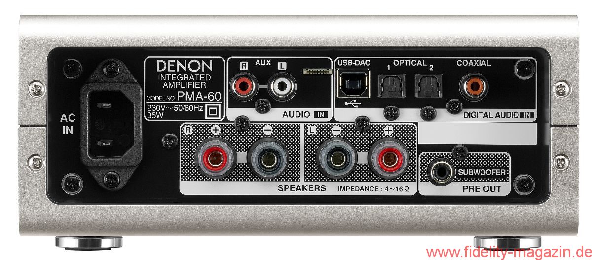Der PMA-60 ist ein vollständig digitaler Verstärker und liefert trotz seiner kompakten Bauweise 50 W pro Kanal. Dank neuester DDFA-Technologie bietet er eine weiter verbesserte Effizienz und extrem geringere Verzerrungen. Das von Denon selbst entwickelte Advanced AL32 Processing und das Master Clock Design sorgen für die akkurate Verarbeitung digitaler Signale ultra-hochaufgelöster Dateien mit bis zu 384kHz/32bit sowie DSD 2,8 MHz/ 5,6 MHz/11,2 MHz und liefert somit Klangqualität, die weit über die einer CD hinausgeht.