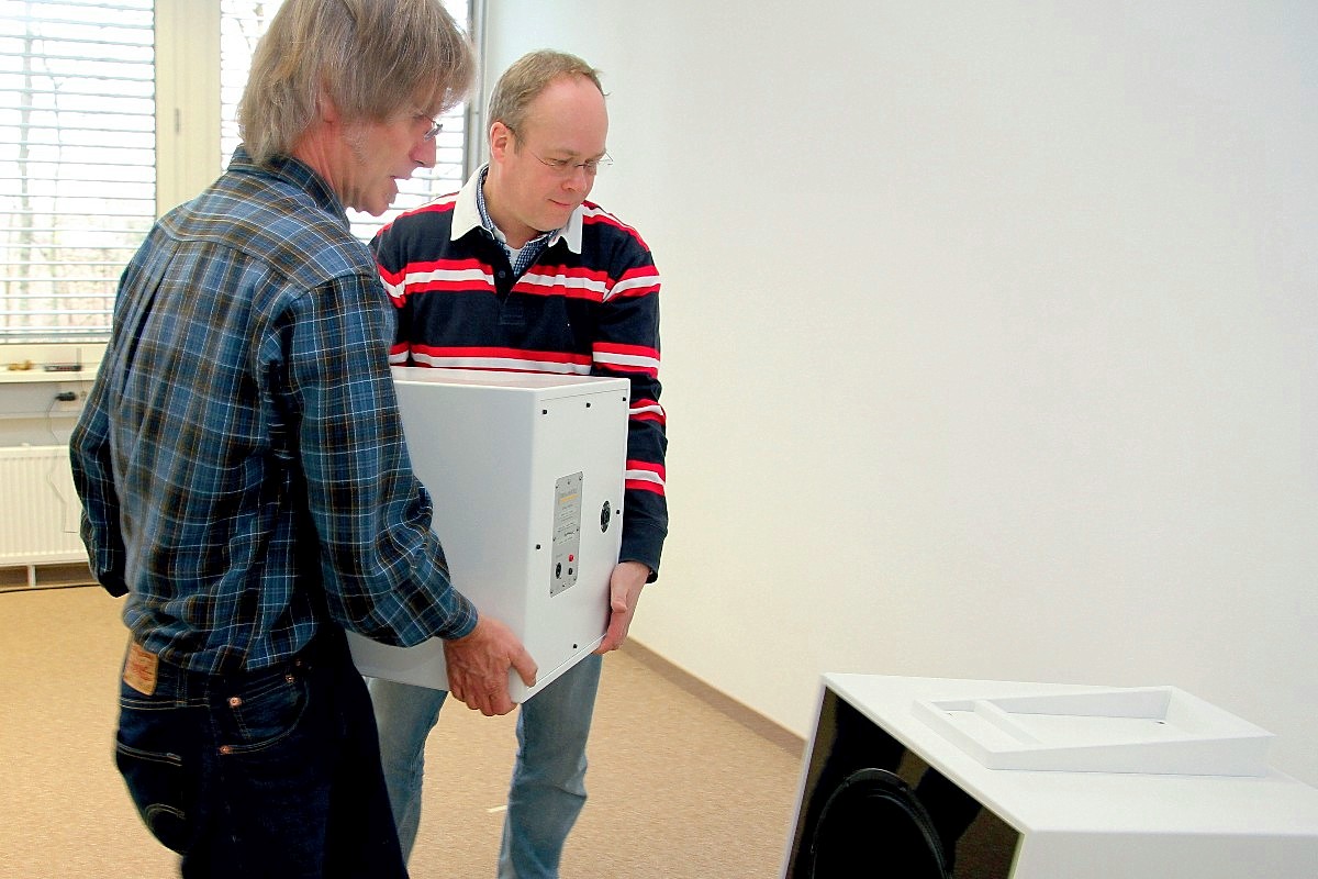 Die Positionierung der beiden 12.18 im Hörraum ist dank langjähriger Erfahrung in einer konzentrierten Stunde erledigt und scheint auf Anhieb ein Treffer zu sein, sofern man aus akustischer Sicht davon sprechen mag. Denn Moning und seine 12.18 haben das Pech (oder die Chance), einen nahezu kahlen, praktisch jungfräulichen Hörraum ein- oder gar entweihen zu müssen. Auch darauf ist Ulf Moning vorbereitet. Kurzerhand verteilt er, akustisch vorteilhaft, alle greifbaren Akustik-Elemente und Stoffdecken, Möbel(chen) und Leerkartons vor allem in den Raumecken und an der Rückwand. Und prompt ist aus einer halbnackten Flatterecho-Kammer ein rundum gemütliches Wohnzimmer geworden. Zwar nicht unbedingt optisch, aber akustisch.