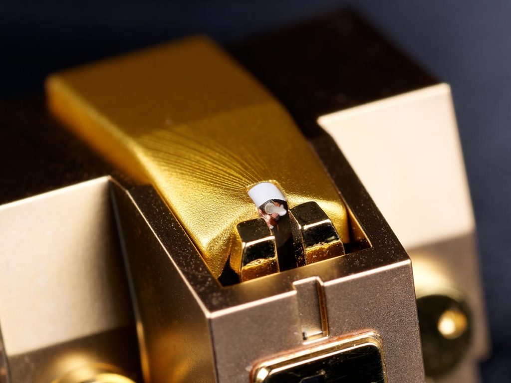 Das ist keineswegs die einzige Veränderung, die das Karat erfahren hat. Immer wieder flossen im Laufe der Jahre größere und kleinere Modifikationen in die Serie ein, die alle aufzuzählen hier den Rahmen sprengen würde. Geblieben sind die für Dynavector typischen Spezialitäten wie „Softened Magnetism“ und „Flux Damping“. Unter Ersterem versteht man anscheinend die bewusste Verwendung von Samarium-Kobalt-Magneten, die im Vergleich zu den heute weit verbreiteten Neodym-Magneten deutlich schwächer sind. „Flux Damping“ hingegen wird mithilfe einer um den vorderen Polschuh gewickelten Kupferspule erreicht: Sie soll die Gegen-EMK („elektromotorische Kraft“) reduzieren, die durch das Magnetfeld der bewegten Spule entsteht. Die schwachen Magneten machen allerdings mehr Windungen auf den Spulen erforderlich, will man auf eine praktikable Ausgangsspannung (0,3 V) kommen. Das erklärt auch die relativ große Systemimpedanz von 32 Ohm. Treu geblieben ist man ebenfalls dem Micro-Ridge-Schliff, der am Ende des diamantenen Nadelträgers eingesetzt wird.