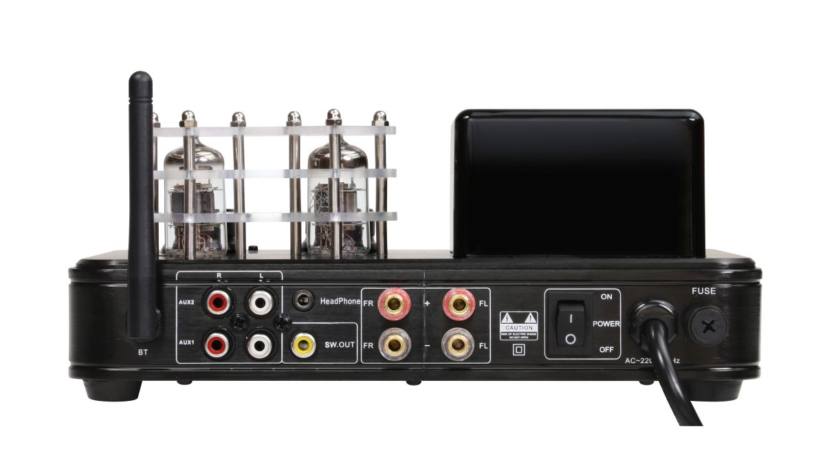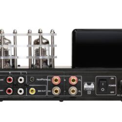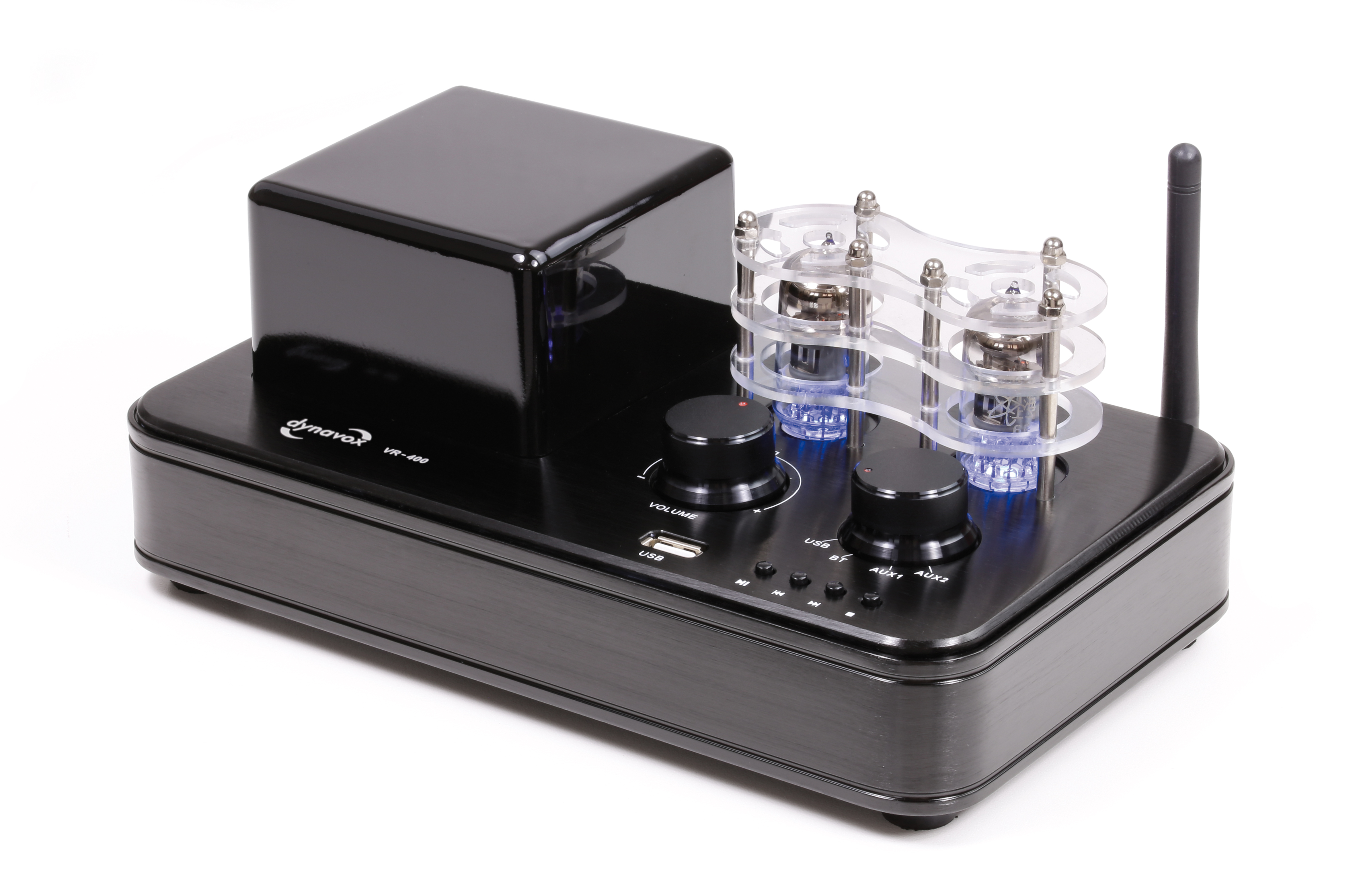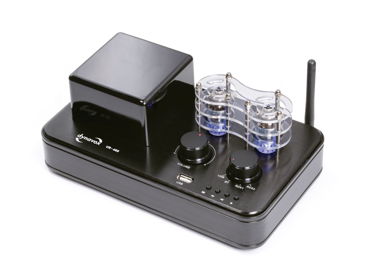 Neben den beiden Cinch-Eingängen für z.B. Tuner, CD o.ä., besitzt der VR-400 einen Ausgang für einen Subwoofer oder eine Endstufe. Zudem verfügt der Hybride über eine 3,5 mm Klinken-Buchse, zum Anschluss Ihres Kopfhörers. Der Empfang von BT-Signalen, sowie der eingebaute USB-Audio-Player (unterstützt MP3, WAV, APE, FLAC) komplettieren das Paket. Dazu kommen die beiden sichtbaren Röhren, die den Signaleingang bearbeiten und dem Klang eine leichte röhrentypische Wärme geben.