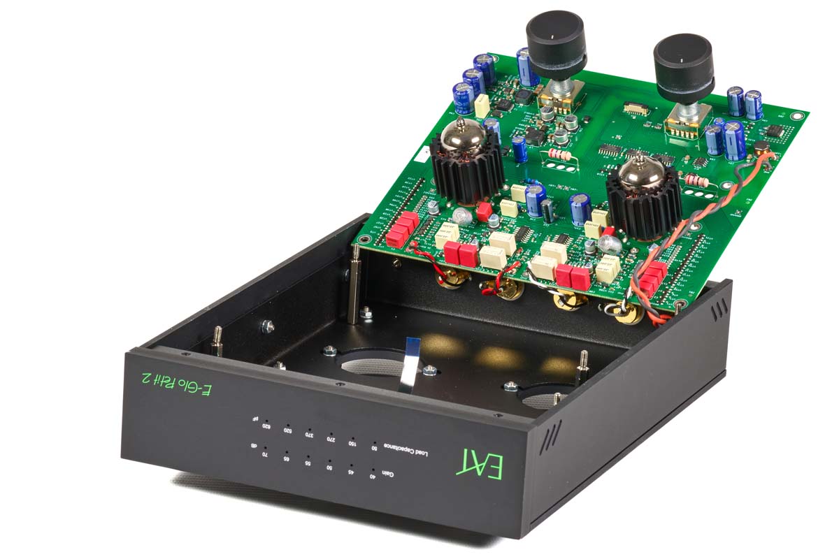 „Das European Audio Team (kurz E.A.T.) steht für audiophile Spitzenqualität, vollendetes Design und wegweisende Innovation“, so die Marketingabteilung des Herstellers. Unter der Leitung von Jozefina Lichtenegger haben die in Tschechien produzierten E.A.T.-Produkte bereits seit Jahren für viel Aufsehen innerhalb der Szene gesorgt. Nicht nur der eine oder andere Plattenspieler des Hauses, sondern insbesondere auch die große Phonovorstufe E-Glo S beeindruckte weltweit das Fachpublikum. Jetzt ist also der E-Glo Petit 2 im Markt – in zweiter Generation für sehr faires Geld. So viel erstmal vorweg. Schon auf den ersten Blick erkennt der Analogfreund einen Verstärker, der es in sich hat – und zwar im wahrsten Sinne des Wortes. Unter den beiden Metallschirmchen befinden sich zwei ECC 83, die durch das speziell entwickelte Netzteil permanent einsatzbereit gehalten werden. Permanent? In der Tat – diese Antwort erhielten wir vom Hersteller auf unsere Nachfrage hin: „Ja, die Röhren bleiben konstant auf Temperatur/geheizt. Das ist bei den Kleinleistungsröhren wie der 12AX7 nicht kritisch, da die Lebensdauer sehr hoch ist, liefert dadurch aber sofort ohne Aufwärmzeit die optimale Performance.“ Des Weiteren erkennt das suchende Auge gleich die beiden serienmäßig eingesetzten Röhrendämpfer. Röhren sind für E.A.T. ohnehin ein Produkt aus eigener Herstellung – passend zur hauseigenen Philosophie „Handmade in Europe“. Natürlich hat die eigene Produktion auch ihre ganz eigene Geschichte. Schon während ihres Studiums an der Wirtschaftsuniversität zu Bratislava arbeitete Jozefina Lichtenegger nebenher beim Röhrenhersteller Vaic in verschiedenen Bereichen von Produktion bis Marketing. So erwarb sie Detailkenntnisse zur Herstellung der verstärkenden Glaskolben und der zugrundeliegenden Technik. Als Alesa Vaic seine Firma schließlich später zumachte, fand die einfallsreiche junge Dame für ihre Kunden eine Möglichkeit, im Tesla-Werk Vršovice die gewünschten Röhren zu produzieren. Diese Produktionsstätte mit einer Fläche von ca. 450 Quadratmetern wurde später von ihr – mit Ausnahme der Senderöhrenherstellung – gekauft. Seitdem erfolgt die Herstellung verschiedener Röhrenpreziosen durch die mitübernommene hochqualifizierte Belegschaft dort. Tubes made in Europe – es geht doch!