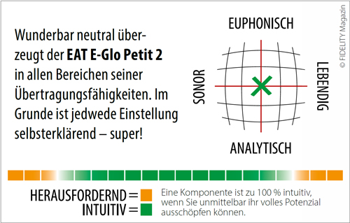 Wunderbar neutral, überzeugt der EAT E-Glo Petit 2 in allen Bereichen seiner Übertragungsfähigkeiten. Im Grunde ist jedwede Einstellung selbsterklärend – super!