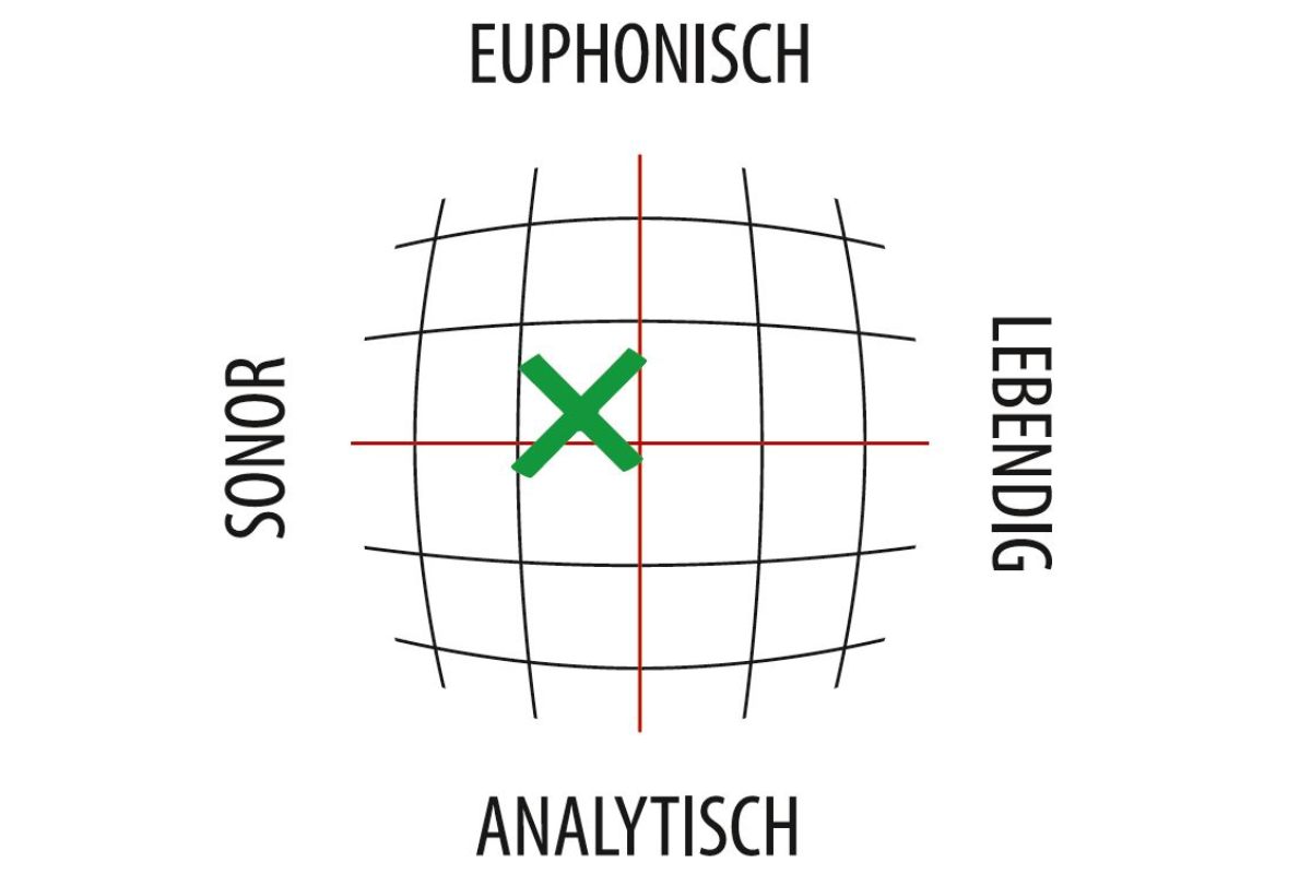 Der FIDELITY-Navigator illustriert den grundlegenden Charakter und den Zugang zu einer HiFi- Komponente – unabhängig von ihrem Preis. Es geht dabei keineswegs um eine Gut-oder-schlecht- Entscheidung, auch nicht um das Preis-Leistungs- Verhältnis oder ähnlich langweilige Dinge, die den Spitzenprodukten unserer Szene ohnehin nicht gerecht werden. So ähnlich, wie es keinen „besten Gitarristen“, „besten Whisky“ oder „besten Urlaubsort“ gibt, so wenig sortiert der FIDELITY-Navigator unsere HiFi-Lieblinge in eine Art Rangliste ein. Nein, der Navigator veranschaulicht zwei – selbstverständlich subjektiv gefärbte – Einschätzungen: 1.) in welche akustische Geschmacksrichtung ein HiFi-Gerät tendiert und 2.) wieviel Aufwand nötig ist, um das klangliche Optimum aus diesem herauszuholen. Das Gitternetz (1) ist dabei als Charakterkompass zu verstehen, auf den man von oben schaut. Das Kreuz im Koordinatensystem verrät, wohin der Klangcharakter tendiert: sonor oder lebendig, euphonisch oder analytisch – alles audiophile Eigenschaften, die im theoretischen Idealfall austariert sind oder aber für einen willkommenen Kick sorgen. Der Querbalken (2) stellt das Verhältnis dar, wieviel Klangvergnügen eine Komponente intuitiv, also ohne größeren Aufwand (grün) bietet – und was mit ein wenig Sorgfalt und Know-how (gelborange) klanglich noch herauszuholen ist.