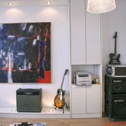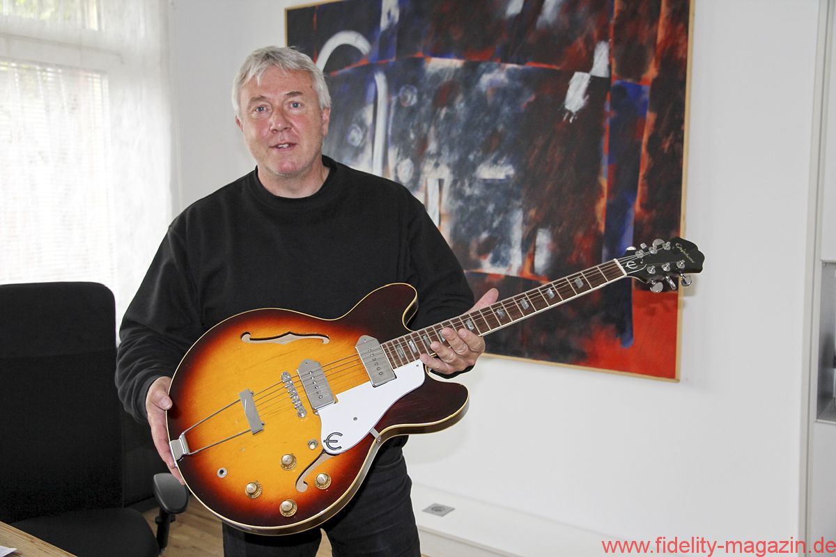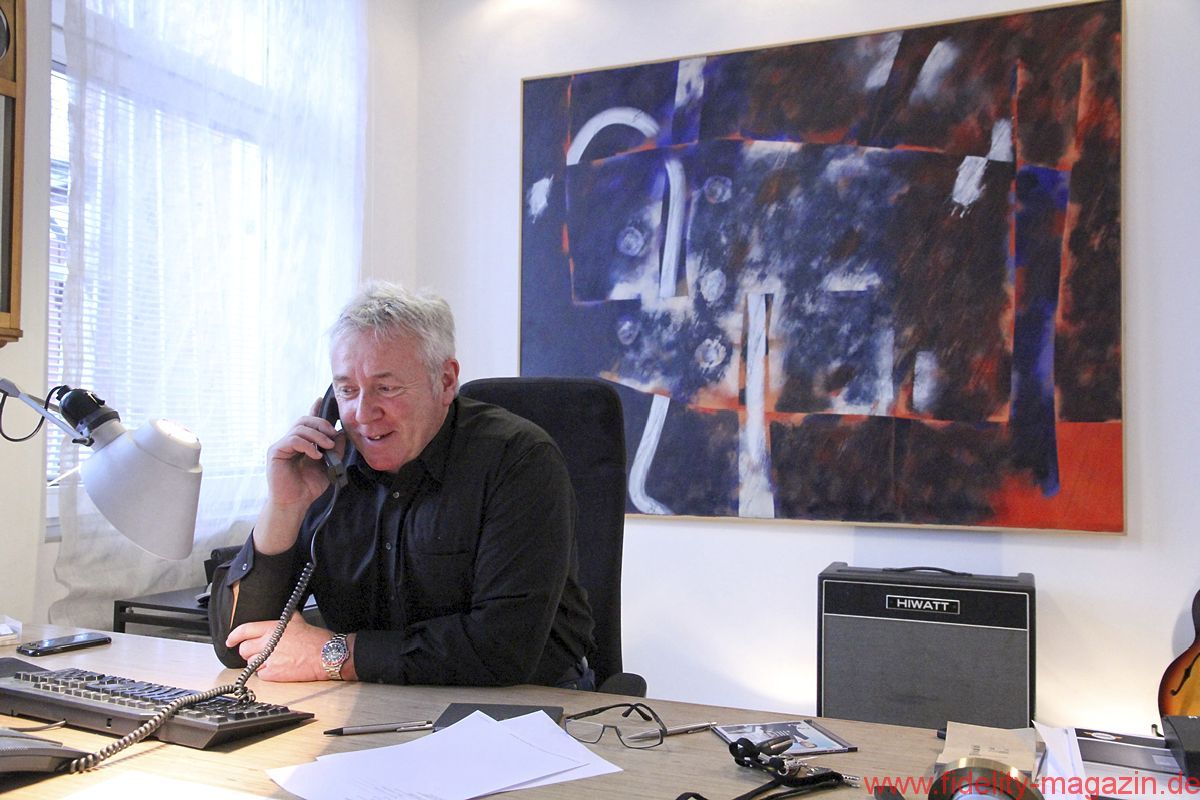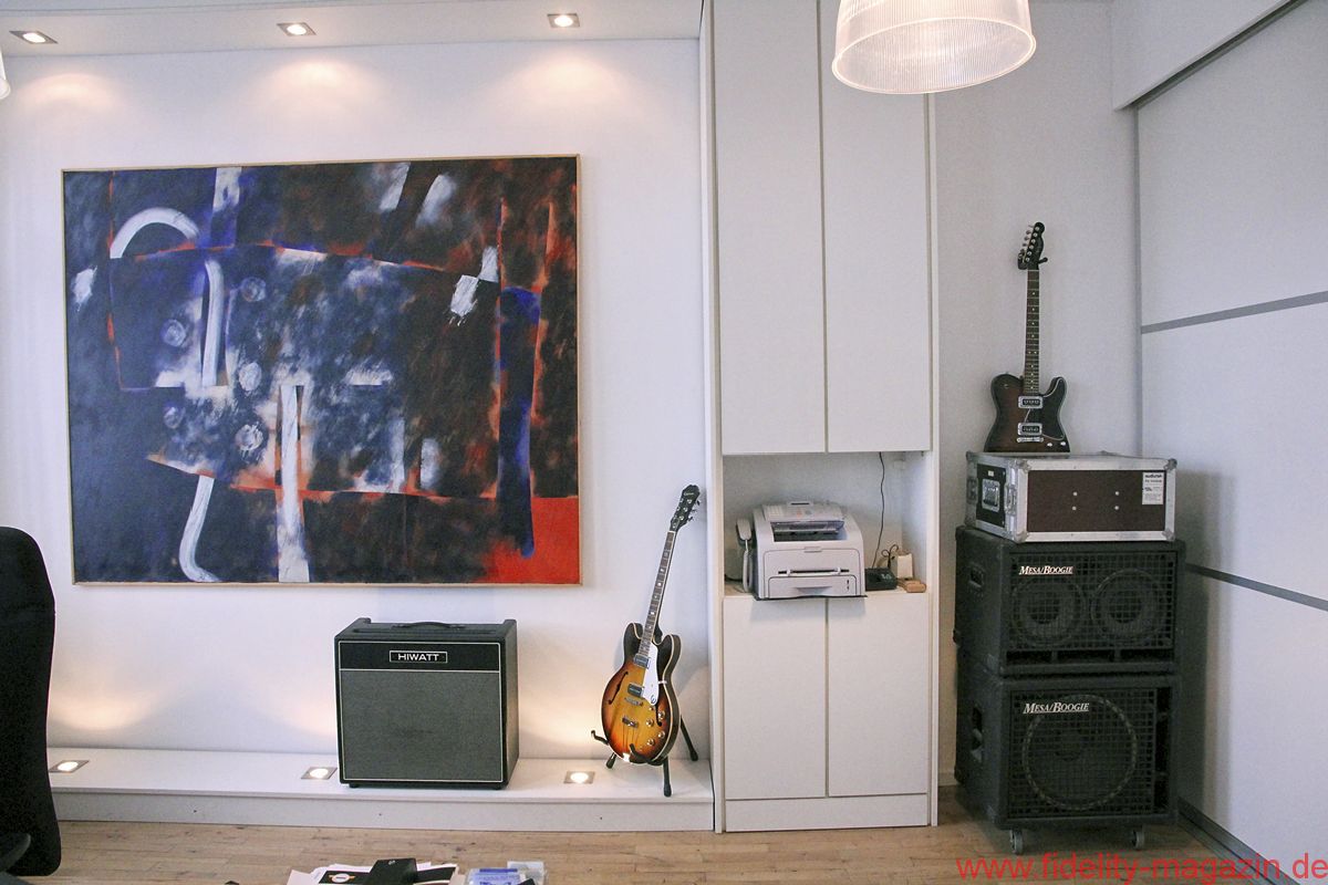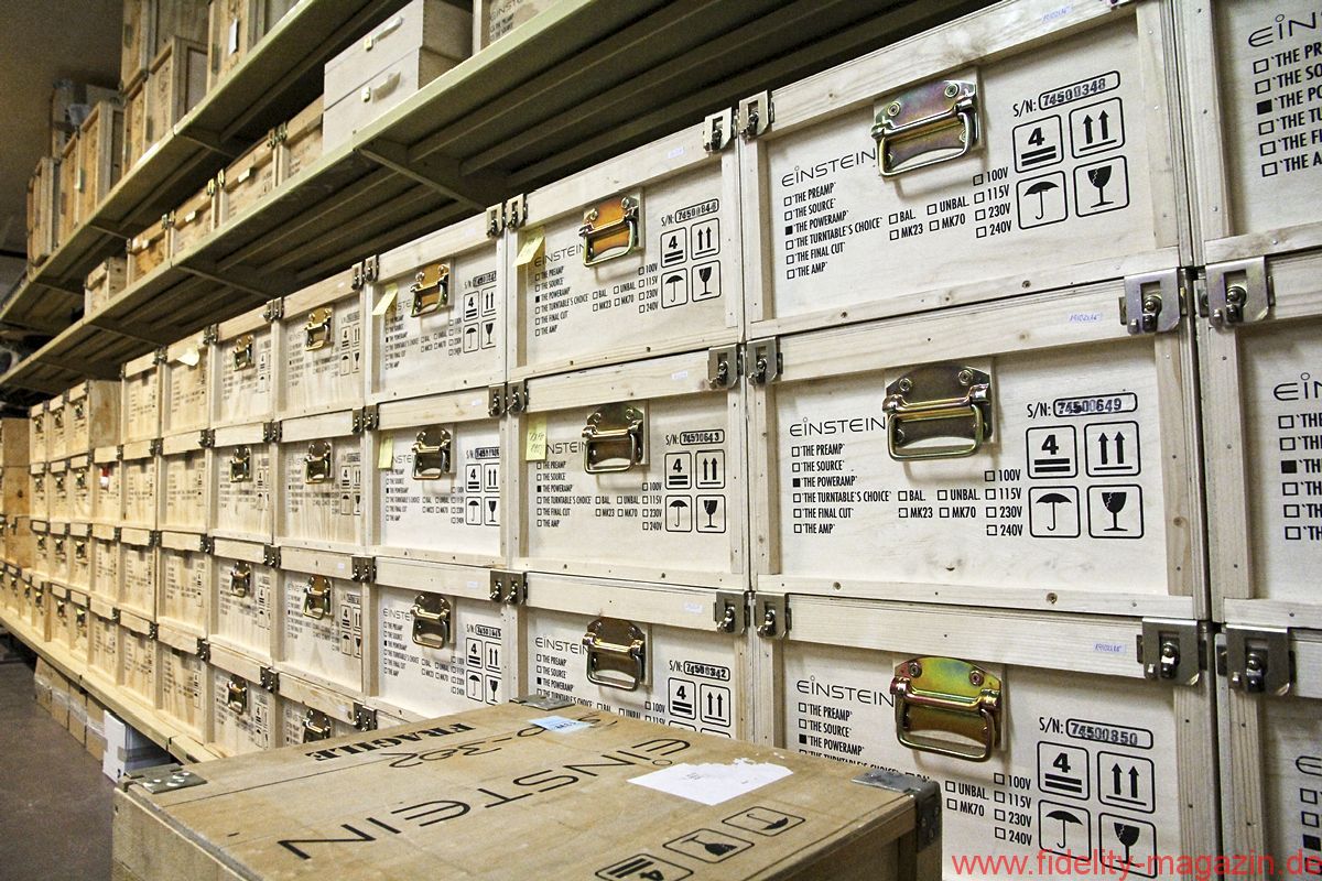 Vor dem Schreibtisch stehen reisefertige Holzkisten mit generalüberholten Schmuckstücken, aber auch eine Charge streng selektierter Röhrensätze („gut 85 Prozent sind für unsere Zwecke nicht gut genug“). Ein Durchgang nach „hinten“, also in Richtung „Haupteingang“, führt direkt ins Teile- und Auslieferlager, die markanten Einstein-Holzkisten dominieren die Szene. Linkerhand blickt man ins helle, großzügige Büro des Einstein-Chefs. Volker Bohlmeier telefoniert, mein Blick schweift vom XL-Schreibtisch über die Wände, die mit E-Gitarren der feineren Art gespickt sind. In der Ecke neben dem Faxgerät steht ein Fender-Gitarrenverstärker auf einer Mesa-Boogie-Box.