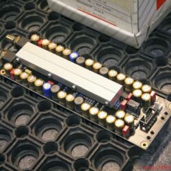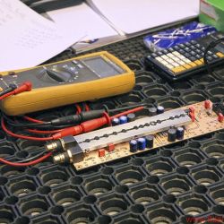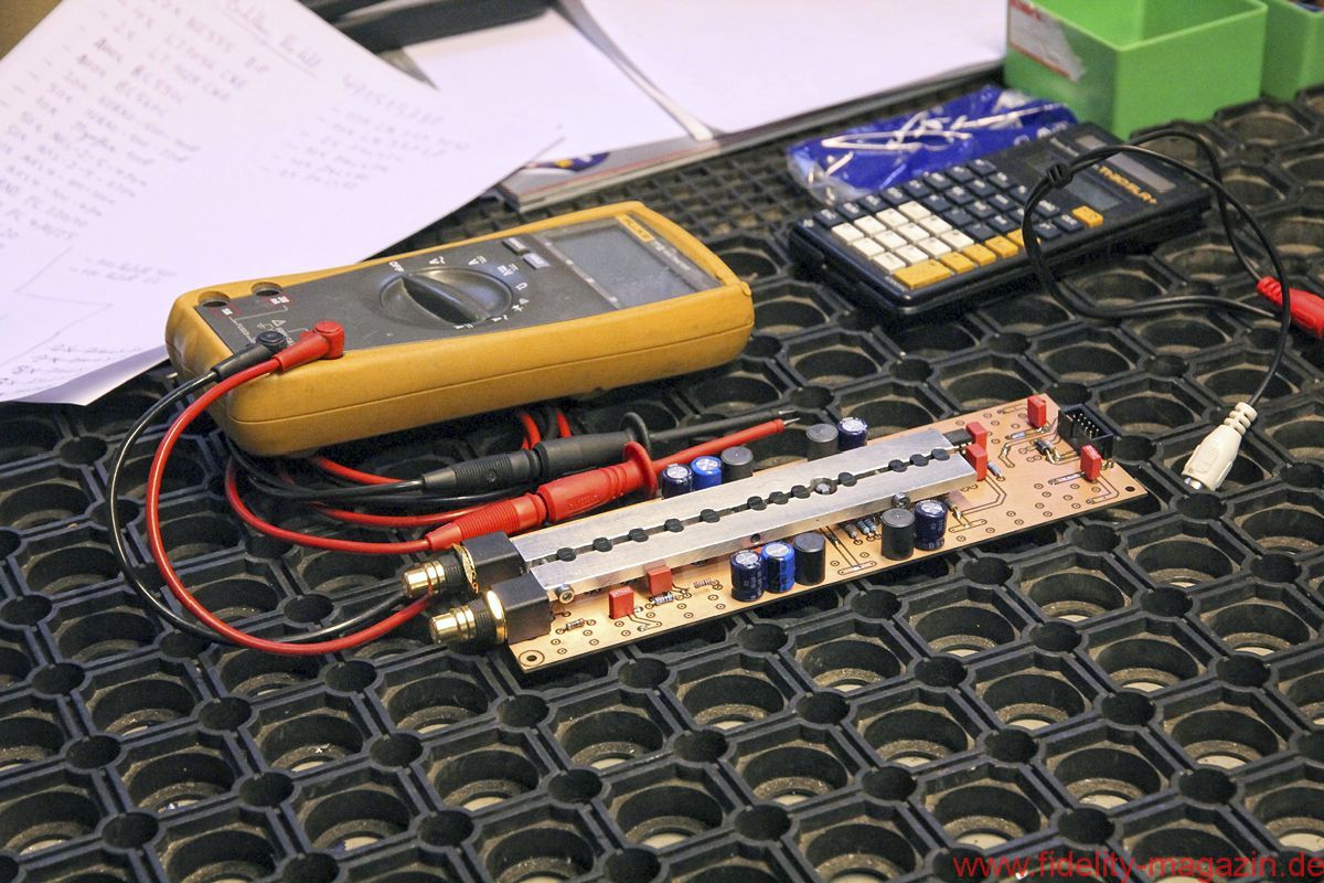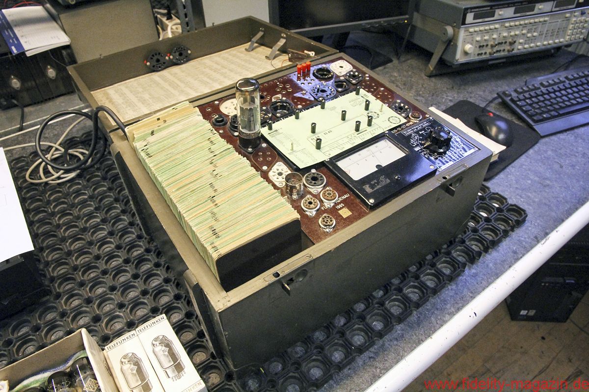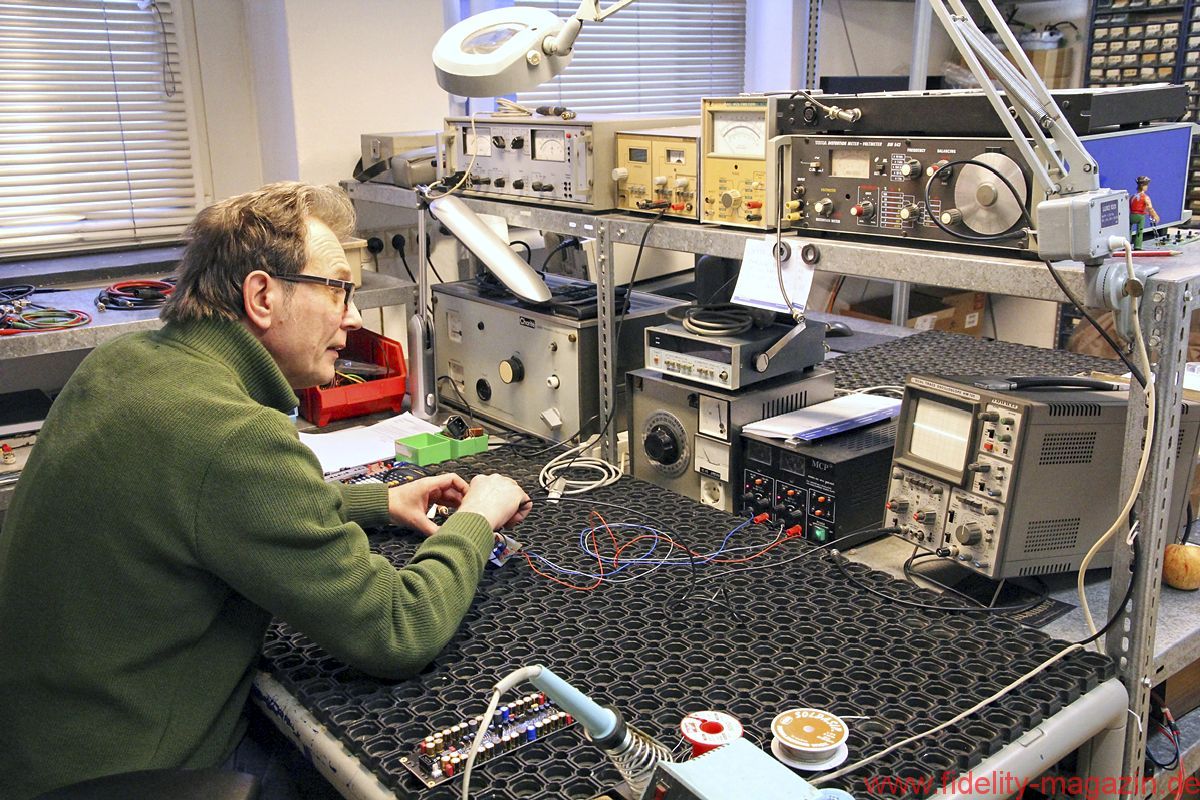 Nach rechts geht’s zur Produktion. Zweimal ums Eck gebogen, schon stößt man auf den ersten Montagetisch, weitere sind auf drei hintereinanderliegende Räume verteilt. Hier findet die Montage bzw. Prüfung jeder Einstein-Komponente statt, überall stehen Messgeräte und Lötstationen bereit, auf einem Schreibtisch entdecke ich einen historischen Röhrenprüfapparat.