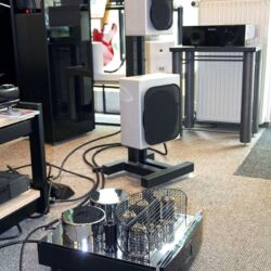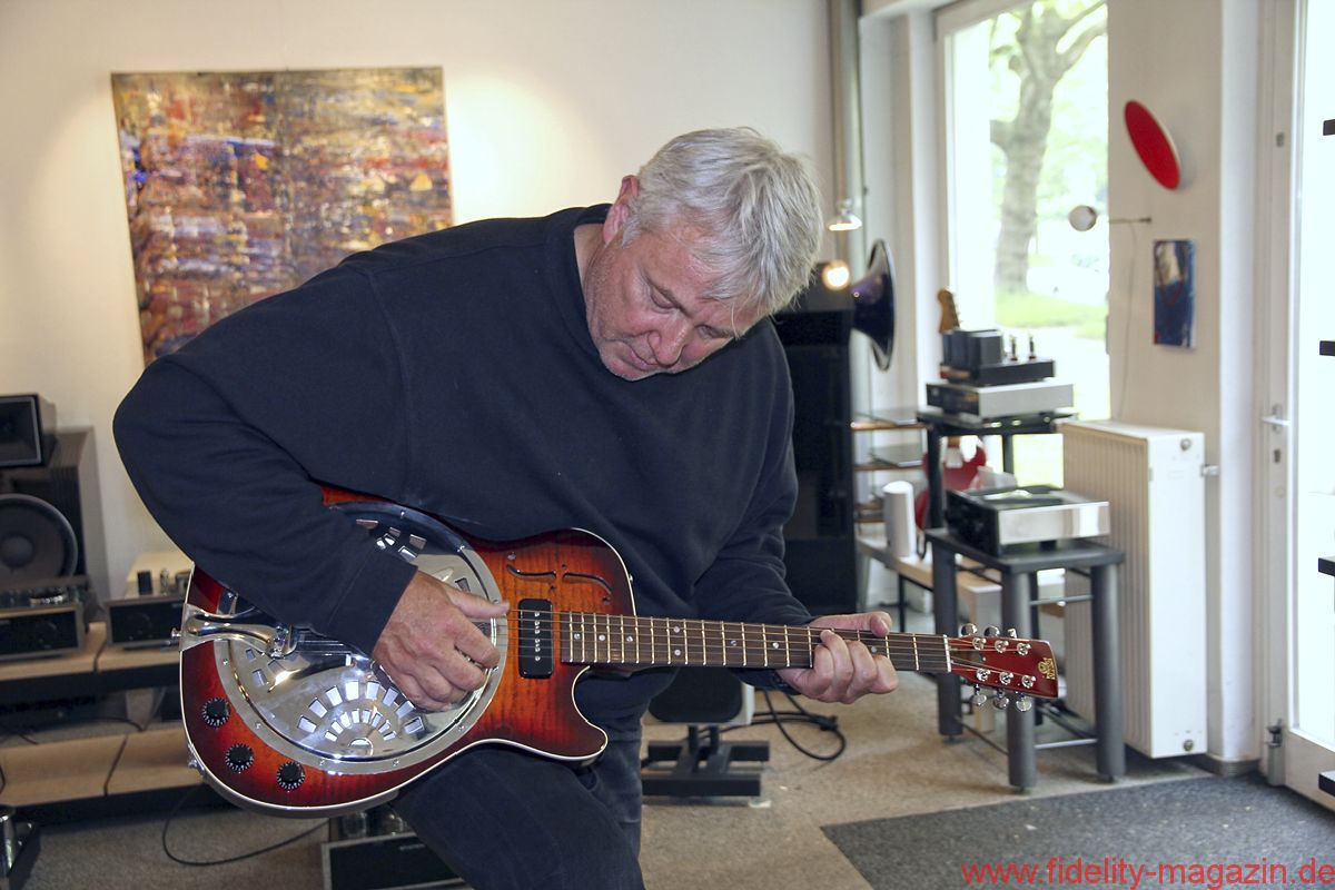 Erstaunlicherweise gelingt es wenig später ohne Probleme, Einsteins entscheidenden „Digitalisten“ vor die Linse zu bekommen. Diplominformatiker Sebastian Schlitte ist vom Vater erst zum Jazz, dann zu HiFi, schließlich zu Einstein Audio gekommen und zeichnet mittlerweile offiziell für die jüngeren Digital-Entwicklungen des Hauses verantwortlich. Rolf Weiler ist vermutlich froh, sich auch weiterhin vorrangig um analoge Verstärkertechnik kümmern zu können. Wir sind mittlerweile ein paar Minuten hinüber zum Showroom des Unternehmens gefahren, wo sich alle Einstein-Komponenten in der audiophilen Praxis und mit anderen Pretiosen in unterschiedlichen Setups bewähren müssen. Hier sind natürlich auch all die anderen Produkte zu erleben, die von Einstein Audio in Deutschland vertrieben werden, etwa die genialen (sic!) Laufwerke von TechDAS oder die massiven Schallwandler von Audiomachina. Es gibt hier aber noch ganz andere Delikatessen. So steht im Hinterzimmer des Shops eine große High-End-Aufschnittmaschine recht prominent zwischen weiteren Gitarrenkoffern, während im vorderen Showroom das Wandregal hinterm Tresen mit ausgesuchten Weinen gut gefüllt ist. Keine Frage: Einstein Audio gründet seit einem Vierteljahrhundert auf einer perfekt ausbalancierten, fein inszenierten Mixtur aus Genuss, Genauigkeit und einer ordentlichen Portion Genialität. Vielleicht sollte man Alberts berühmte Formel (E = mc2) mal ganz anders formulieren. Wie wär’s mit: Einstein = Master of Ceremony zum Quadrat?