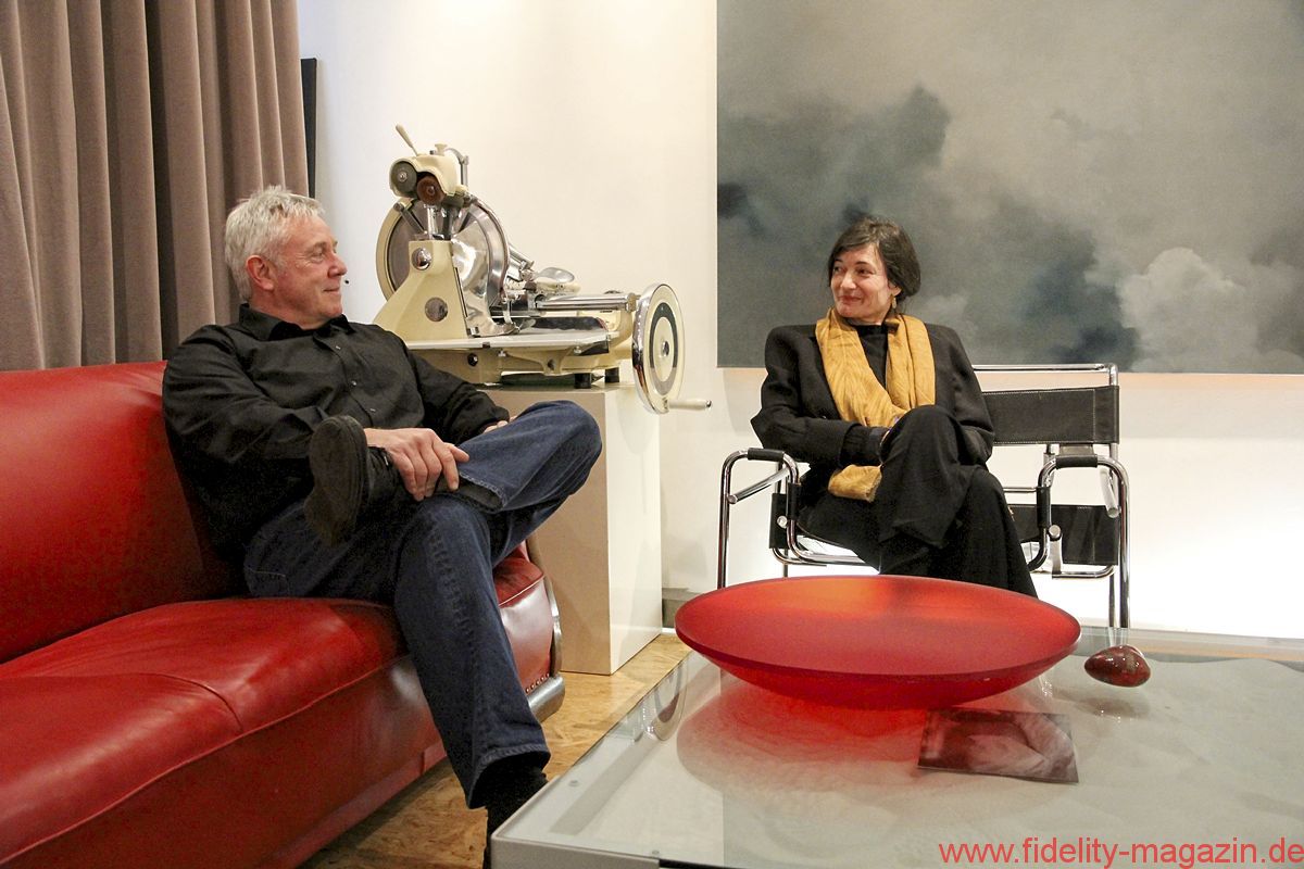 Damit noch mal zurück zum Klingelknopf. Vom Parkplatz aus ist es wortwörtlich naheliegend, logisch gar, Einstein Audio durch den „Hauptnebeneingang“ zu betreten. Guten Tach, kommse rein – und schon steht man unmittelbar im Geschehen. Das aber grundsätzlich ruhig und diszipliniert abläuft. Hektik ist einer Manufaktur nicht zuträglich. Sorgfalt geht vor Schicht- oder Schachtrekord.Im Eingangsbereich steht der Schreibtisch von Annette Heiss. Sie ist einerseits als „Finanzfee“ für die Buchhaltung zuständig, andererseits ist sie Einstein-Gründungsmitglied, Co-Chefin und Gestalterin, daher auch entscheidend für die Außenwirkung des Unternehmens verantwortlich. In unmittelbarer Nähe ihres Schreibtisches sind Form-, Farb- und Materialstudien drapiert, an den Wänden hängen farbenfrohe Gemälde, Produktplakate, Auszeichnungen – und eine echte Goldene Schallplatte: Talk Is Cheap von Keith Richards. Die Soloscheibe des Stones-Gitarristen erschien 1988, im Jahr der Gründung von Einstein Audio.