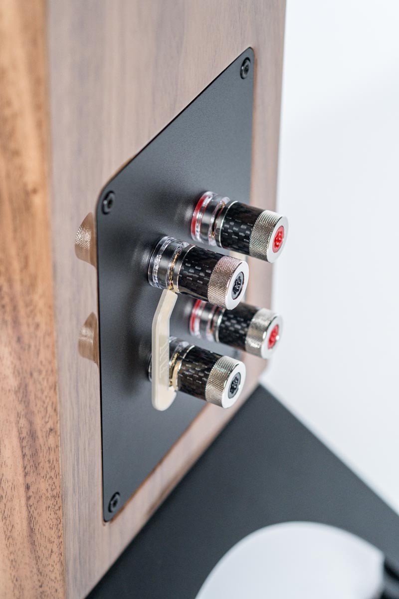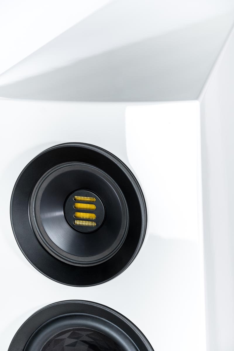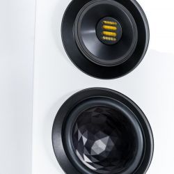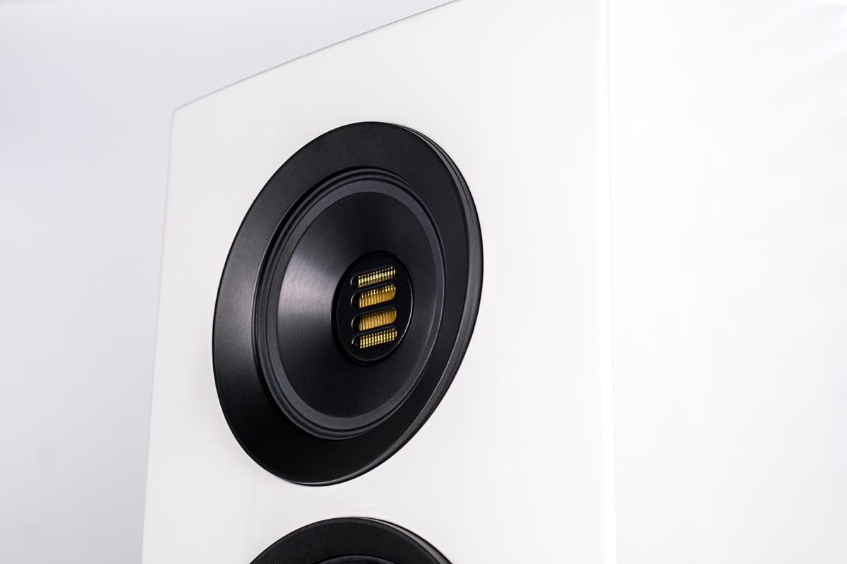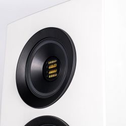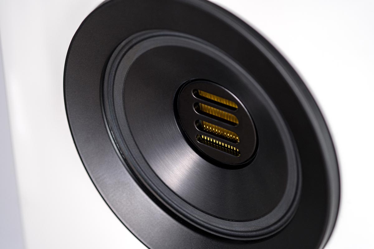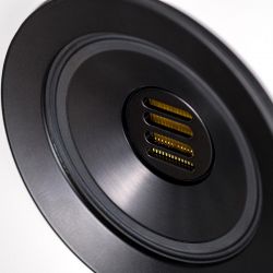 Selbstverständlich verzichtet auch die Concentro S 509 nicht auf den aufwendigen Koaxialtreiber Step X-JET, in dessen Zentrum der neue Folienhochtöner JET 5c werkelt. Das Mitteltonchassis aus Aluminium ist als Ringstrahler ausgeführt. Seine Abstrahlcharakteristik lässt sich mittels magnetischer Aluminiumringe (genannt DCR = „Directivity Control Ring“) variieren: Diese verändern das Verhältnis von Direkt- und Diffusschall und ermöglichen so, eine Anpassung an die individuelle Raumakustik vorzunehmen und damit den optimalen Hörabstand zu finden.