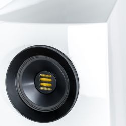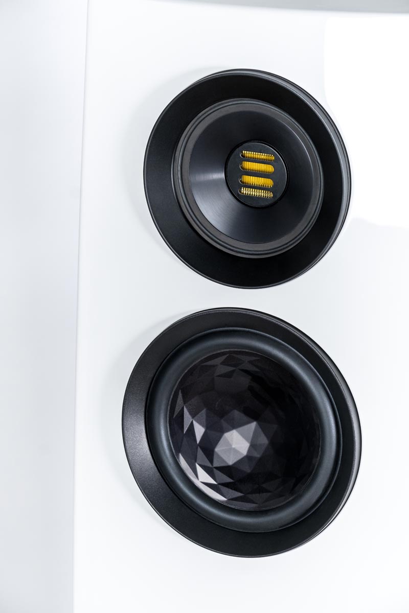 Auch den kristallin geformten Tiefmitteltontreiber kennt man nicht erst seit der „großen“ Concentro. Das Verbundchassis aus Aluminium und Zellstoff ist besonders leicht und dabei extrem steif, was hohe Dynamik bei geringsten Verzerrungen verspricht. Für die tiefsten Frequenzlagen besitzt die Concentro S gleich vier jeweils 18 Zentimeter durchmessende Basschassis in Push-Push/Pull-Pull-Anordung, die auf ein „Downfiring“-Bassreflexrohr arbeiten, was die Aufstellung der Lautsprecher im Raum flexibel gestaltet.