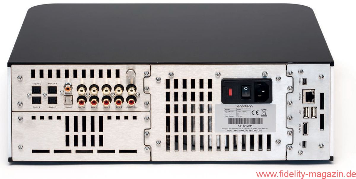 Der multifunktionale Medien-Server Plato PRE von entotem ermöglicht modernsten Streaming-Komfort im heimischen Wohnambiente und verzichtet bewusst auf eine interne Endstufe, da er sich per Vorverstärkerausgang problemlos mit jeder externen Endstufe oder mit Aktivlautsprechern kombinieren lässt. Wie ein herkömmlicher HiFi-Verstärker besitzt Plato einen Vorverstärker mit Klangregelung und unterschiedlichen Eingängen inklusive MM/MC-Phonovorstufe. So kann also beispielsweise eine bereits vorhandene HiFi-Anlage nebst Plattenspieler zusammen mit Plato genutzt werden, um klangliche Spitzenqualität in den Raum zu zaubern.