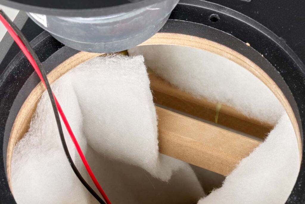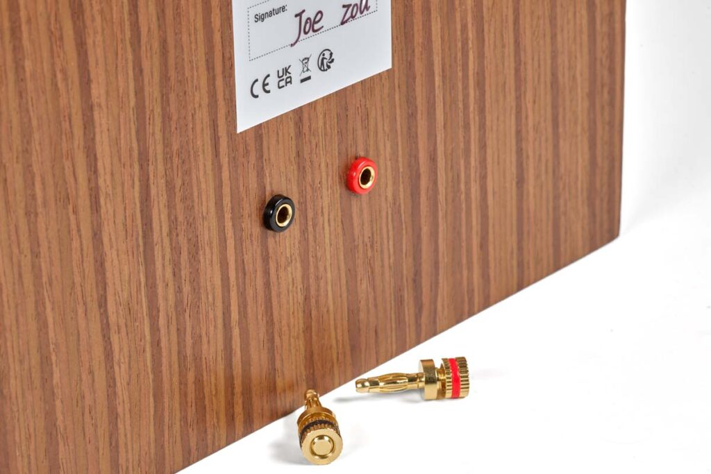 Die Form des Gehäuses ist jedoch anders. Die vordere Schallwand ist nach hinten geneigt, um den Tieftöner und den Hochtöner zeitlich aufeinander abzustimmen und die stehende Welle zwischen Vorder- und Rückseite zu unterstützen. Die Öffnung des Reflexsystems befindet sich auf der Rückseite des Gehäuses, und die gesamte Form der Öffnung wurde so gewählt, dass Luftströmungsgeräusche minimiert werden. Hier hat man sich bei FinkTeam an der Konstruktion der Modelle Borg und Kim orientiert und das Reflexsystem mehr oder weniger von dort importiert. Die Frontplatte ist ein zusätzliches Teil, das auf das Hauptgehäuse geklebt und geschraubt wird. Sie ist mit einer 45-Grad-Abschrägung versehen, um den Beugungseffekt im Bereich von zwei bis drei Kilohertz zu kontrollieren. Die Polklemmen sind Vier-Millimeter-Bananenbuchsen, die auf einer Metallplatte montiert sind. Diese Bananenbuchsen verwenden intern sehr wenig Metall, um den besten Klang zu garantieren – das ist eine der schönen Ideen des ursprünglichen Designs und besser als die Verwendung von sehr teuren „High-End“-Klemmen mit wenig Metall, aber einem hohen Preisschild. Wie immer bei Karl-Heinz Fink und seinem Team zählt auch hier das Ergebnis und weniger die äußere Aura.