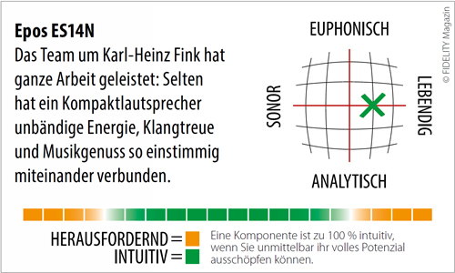 Das Team um Karl-Heinz Fink hat ganze Arbeit geleistet: Selten hat ein Kompaktlautsprecher unbändige Energie, Klangtreue und Musikgenuss so einstimmig miteinander verbunden wie die Epos ES14N.