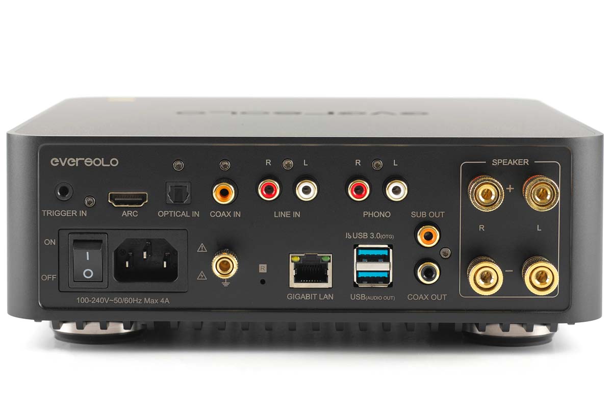 Die Klänge gibt der Eversolo Play digital oder analog aus. Digital ist die Maximalauflösung mit 32 Bit/768 Kilohertz am USB-3.0-Audioausgang ehrfurchtgebietend hoch, entsprechende DACs können via USB angeschlossen werden. Dazu gibt es noch einen S/PDIF-Ausgang mit der Höchstauflösung von 24 Bit/192 Kilohertz, sodass die schnelle Integration ins vorhandene, digitalbasierte System geschwind erledigt ist.
