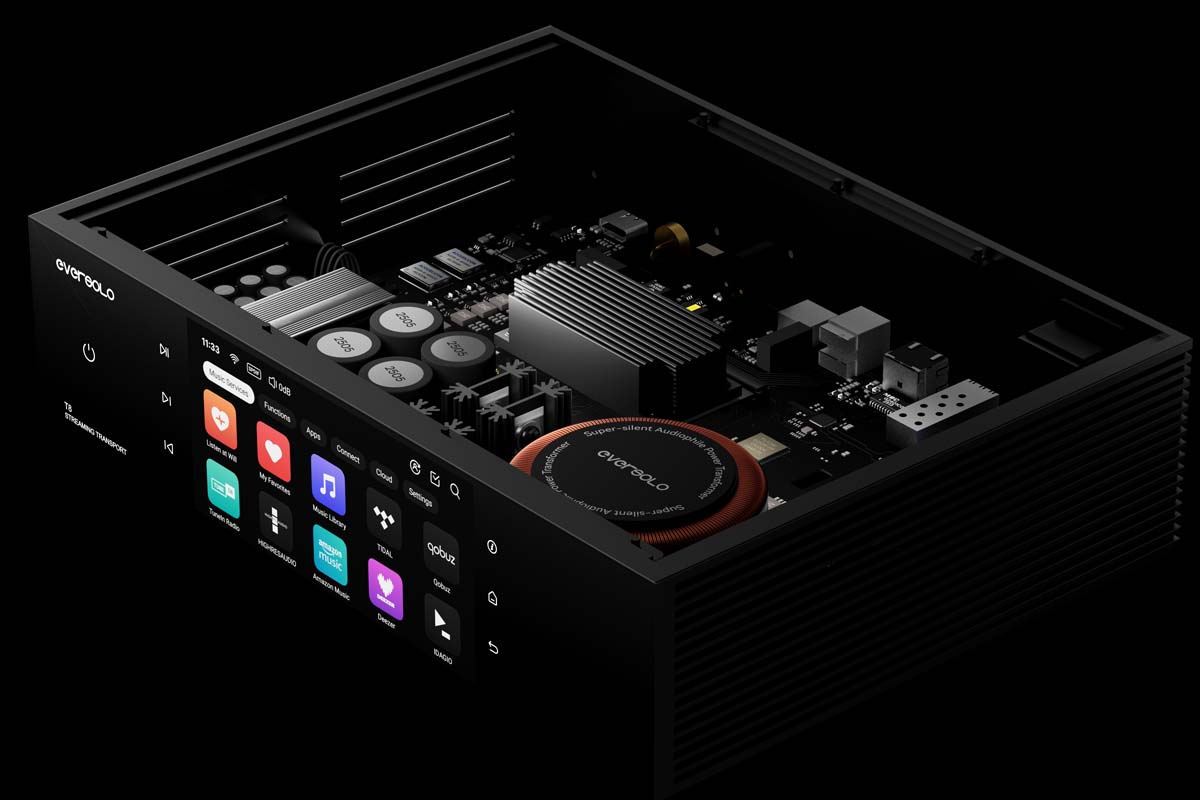 Fangen wir beim hochwertigen linearen Netzteil mit Ringkerntransformator an. Der liefert über teflonisolierte Kabel seine Spannungen an eine raumgreifende Spannungsaufbereitung, die mehr als ein Drittel des Gehäuses einnimmt. Eine möglichst rauscharme Stromversorgung ist aus Sicht der Entwickler wichtig, weil zahlreiche empfindliche Schaltungen im T8 untergebracht sind. Zuerst ist das sicherlich die extrem genaue Femto-Clock, die das digitale Klanggeschehen mit hoher Präzision taktet und so Probleme wie Taktzittern (Jittern) weitestgehend außen vor lässt. Hier sind zwei Taktreferenzen verbaut, jeweils bezogen auf die mathematischen Vielfachen der üblichen Samplingraten 44,1 Kilohertz oder 48 Kilohertz – so werden Rundungsfehler bei einer der beiden Grundfrequenzen verhindert, eine klangschädliche Umwandlung der Samplerate findet zu keiner Zeit statt. Die Entwickler haben das „Eversolo Original Sampling Rate Audio Engine“ genannt.