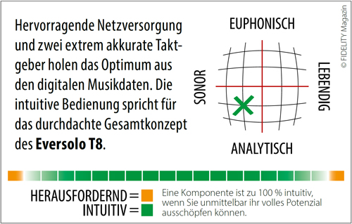 Das mit jedem Hören wachsende Album Gentō der Supergroup Bioscope (Steve Rothery und Thorsten Quaeschning) erklingt via Qobuz. Der T8 ist dabei an meinen Luxman-Wandler angeschlossen, da er wie gesagt nur digitale Ausgänge besitzt. Offenbar macht sich der sorgfältige Umgang mit den digitalen Musikdaten bezahlt, denn das Klanggeschehen wirkt vom ersten Moment an groß, aufgeräumt und über den gesamten Hörbereich hoch aufgelöst. Sowohl tiefe Bässe aus den Synthesizern von Quaeschning als auch die durch den Roland-Jazz-Chorus des Marillion-Gitarristen verstärkten Klänge überzeugen durch gute räumliche Trennung, aber eben auch musikalisches Zusammenspiel. Dadurch, dass der T8 ein aufgeräumtes Signal an den Wandler weitergibt, löst sich die Musik plastisch vom Lautsprecher. Es kommt der von mir präferierten Abstimmung meiner Anlage nochmals zugute, denn dank der guten Quelle kann auch der Rest der Komponenten zeigen, was geht. Zwar sagt Eversolo selbst, dass der Klang hauptsächlich durch die Auswahl des eigenen Wandlers bestimmt wird, doch aus Erfahrung weiß ich, dass ein guter Transport (egal ob als CD-Laufwerk oder Streamer) eben das entscheidende Quäntchen mehr an Qualität liefern kann. Oft hatte in der Vergangenheit dabei ein gutes Netzteil eine Rolle gespielt, und das ist eben auch beim T8 von ausgesucht guter Qualität.