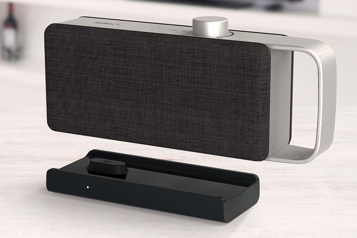 Wenn ich das Aussehen eben mit einem Smart Speaker verglichen habe, muss ich eine Kleinigkeit vorweg klarstellen: Der Oskar ist kein Bluetooth-Gerät. Die Haupteinheit ruht auf einer Sende-/Ladestation, die per 3,5-Millimeter-Klinke oder Toslink-Kabel mit einem Gerät wie einem Fernseher, einem Computer oder einer Spielekonsole verbandelt wird, und gibt dessen Audiosignal wieder. Die kabellose Verbindung zur Station mit einer Reichweite von bis zu 30 Metern sollte so ziemlich jede Wohnung abdecken – meine ist sicherlich kein Extremfall, aber ich hatte beim Probeabgehen jedenfalls keinerlei Verbindungsprobleme. Der integrierte Akku hält den Lautsprecher bis zu 16 Stunden am Laufen, man kann also im Prinzip den ganzen Tag lang die Stimme des Fernsehers zwischen Wohnzimmer, Küche und Schlafzimmer hin- und hertragen, ohne sich um die Stromsituation sorgen zu müssen. Selbst mit deaktivierter Sprachverstärkung klingt der Oskar sauber und definiert, dank Alugehäuse singen und sprechen dabei auch wirklich nur die beiden 35-Millimeter-Breitbänder plus Passivmembran, er bietet sich innerhalb der eigenen vier Wände also durchaus auch als mobile Hintergrund-Musikmaschine an.