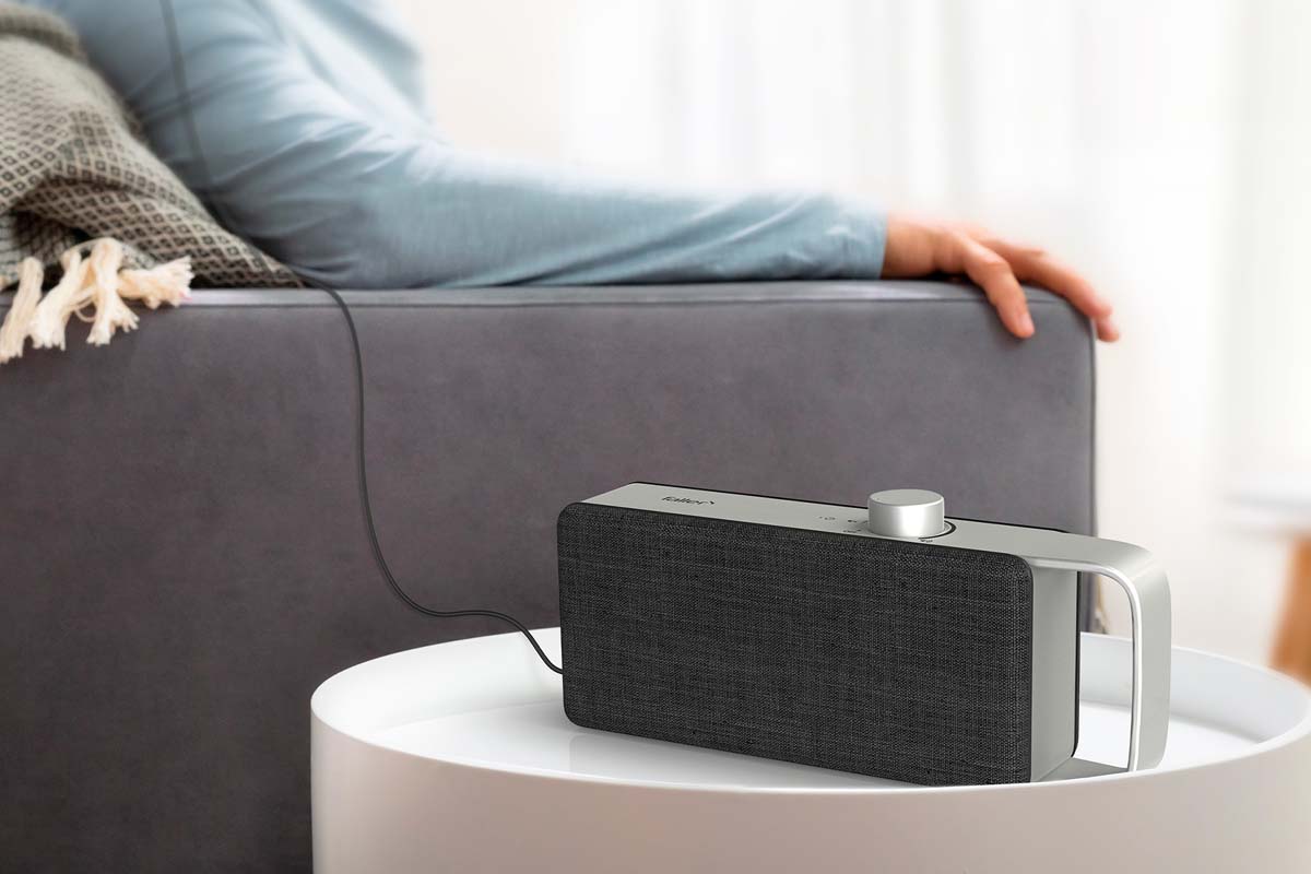 Auf den ersten Blick sieht der Oskar wie ein gewöhnlicher Smart Speaker aus, wobei mir direkt beim Auspacken schon auffällt, wie sauber der Klangziegel verarbeitet ist: Ein Aluminiumgehäuse hätte ich bei dem Kurs nicht erwartet, der Aufbau wirkt wie aus einem Guss, und der Lautstärkeregler, der zugleich als Ein-/Ausschalter fungiert, läuft richtig schön spielfrei und mit samtigem Widerstand. Umlaufende Gummiwülste sorgen für sicheren Stand, ganz gleich, ob er auf der Seite liegend oder aufrecht aufgestellt wird. Nettes Detail: Der Metallkorpus läuft in einem kleinen Henkel aus, an dem man den Lautsprecher durch die Wohnung tragen kann.