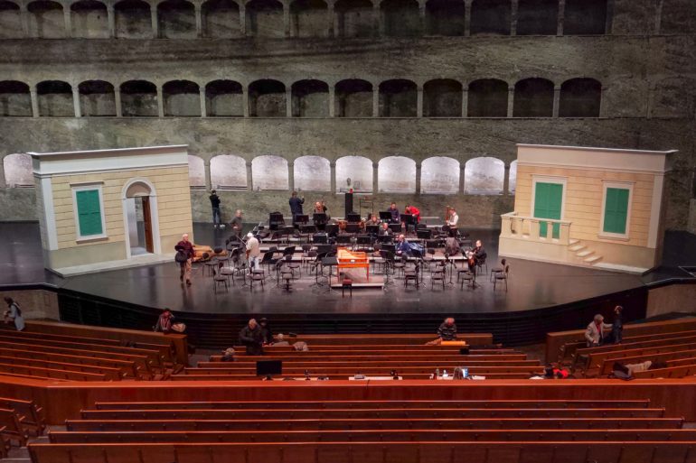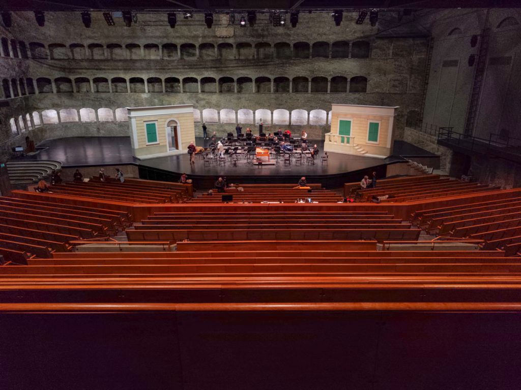 Um den Ort bespielbar zu machen, fehlten eine Bühne, ein richtiger Zuschauerbereich und ein Dach. Die Bühne wurde geschaffen, indem man die Rollen vertauschte: Die in den Fels gehauenen Arkadengänge, die einst als Zuschauertribünen dienten, fungierten fortan als pittoreske Naturkulisse, die riesige und asymmetrische Bühne entstand direkt davor. Der Zuschauerraum wurde mehrfach neu gestaltet, in der aktuellen Form finden fast 1500 Menschen Platz. Auch das Dach machte von nicht vorhanden über Zelt bis zur heutigen festen Form mehrere Evolutionsstufen durch. Herausgekommen ist ein ungemein spannender Saal, der sich mit kaum einem anderen vergleichen lässt.