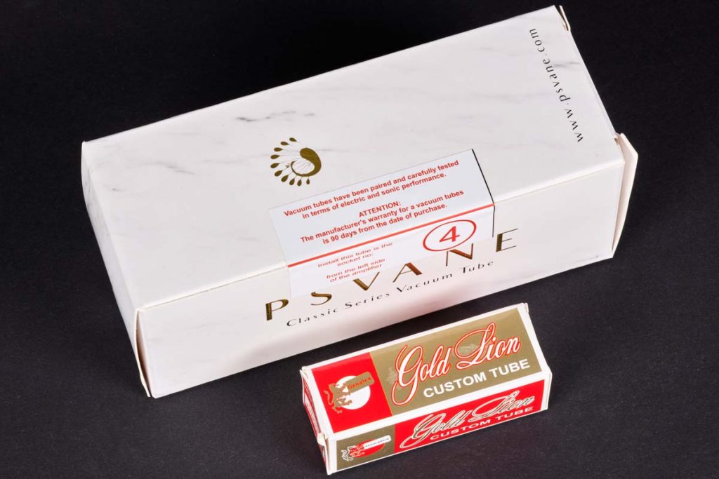In vorderster Front stehen vier KT88-Röhren aus der Psvane-Classic-Serie für die Ausgangsstufe und zwei ECC83 von Gold Lion für die Vorverstärkung und Treiberstufe. Das Gerät und die Röhren sind in der vorbildlich stabilen Verpackung absolut sicher verstaut und jede Röhre ist für ihren Platz auf dem Titania nummeriert. Hier merkt man die Sorgfalt und Liebe zum Detail bei Fezz Audio. Auch ist die Modellbezeichnung jeweils einem Himmelsobjekt gewidmet – für die Titania stand ein Mond des Planeten Uranus Pate. Hinter den Röhren befinden sich drei stattliche Zylinder, die die beiden Ringkern-Ausgangsübertrager und mittig das Netzteil beherbergen. Das Gehäuse wird dadurch hecklastig, was beim beschwingten Anheben aus dem Karton bedacht werden sollte. Steht der Titania erstmal auf seinem Platz, ist er durch die Antivibrationsfüße aus einer Gummimischung optimal vom Untergrund entkoppelt.