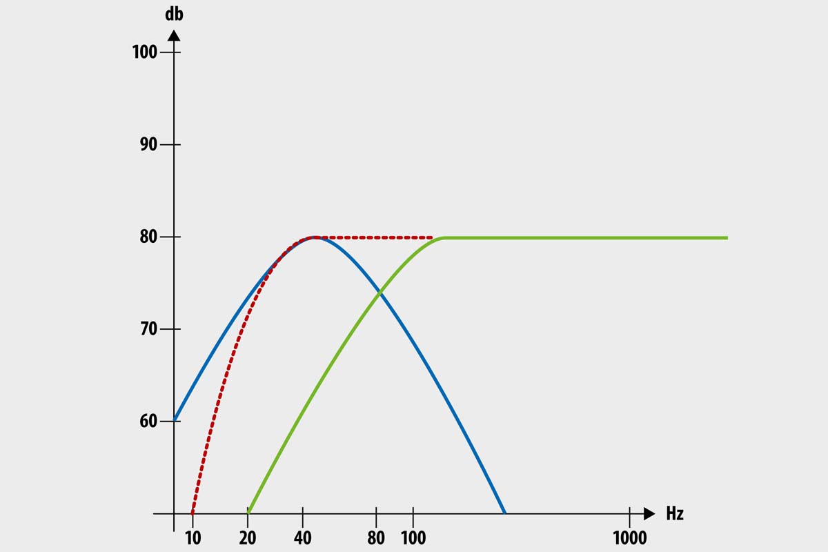 Da es den eingangs erwähnten „Free Lunch“ jedoch in der Tat nicht gibt, bringt dieser Kniff auch Nachteile mit sich; der für unser Thema relevante ergibt sich logisch aus dem Funktionsprinzip: Der Pegel der Bassreflexresonanz sinkt zu beiden Seiten mit je 12 Dezibel/Oktave ab – dadurch ist es überhaupt möglich, den Bassabfall des Treibers mit dem Anstieg zur Port-Resonanz hin zu einer glatten Übertragungsfunktion zu addieren. Unterhalb der Tuningfrequenz addieren sich die Filterflanken ebenfalls – allerdings sind sie hier nicht gegenläufig und heben sich deshalb nicht gegenseitig auf, sondern verstärken sich im Gegenteil, sodass der Basspegel eines Bassreflexlautsprechers unterhalb seiner Eckfrequenz um 24 Dezibel/Oktave abfällt.