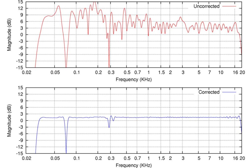 Doch bleiben wir erstmal an unserem Hörplatz sitzen: Man kann sich natürlich die Frage stellen, ob nicht nur das Endergebnis zählt. Wenn die Lautsprecher-Raum-Interaktion zur Verfälschung des Frequenzgangs führt, wird durch das Glattbügeln dieser Abweichungen nicht am Ende alles richtig? Hier gibt es einen kleinen Haken: Unser Gehör lässt sich nicht so leicht hinters Licht führen – es kann zwischen direktem und reflektiertem Schall unterscheiden, solange der Zeitversatz zwischen den beiden mindestens fünf Millisekunden beträgt. Ein kleines Gedankenexperiment: Weil Hilary Hahn nichts Besseres mit ihrer Zeit anzufangen weiß, spielt sie in unserem Hörraum für uns ihre Geige. Der Schall löst sich unmanipuliert von ihrem Instrument und wird dann vom Raumhall überlagert. Könnten wir den Frequenzgang der Violine so anpassen, dass das Endergebnis deren Klang im luftleeren Raum entspricht, würde am Ende der Raum klingen wie eine Geige und die Geige wie ein Negativabzug des Raumhalls. Unser Ohr kann das so aufdröseln, und ich kann Ihnen versprechen, das Resultat würde Ihnen nicht gefallen.