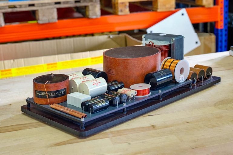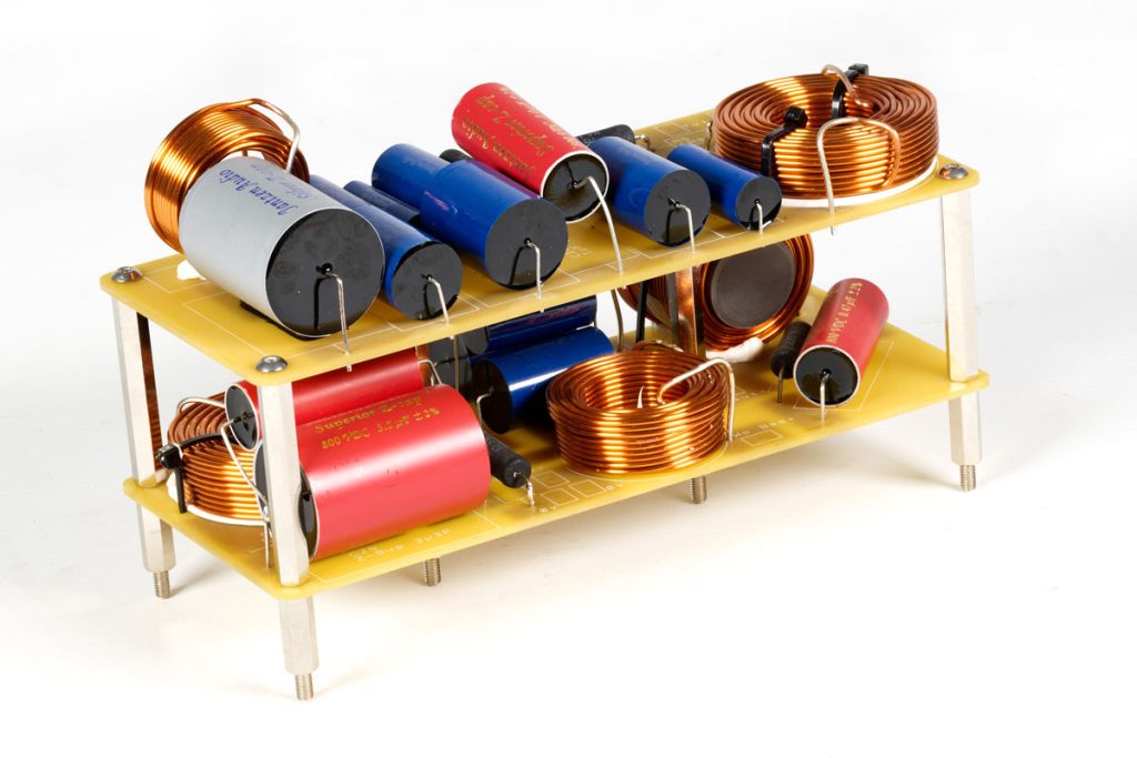 Um das notwendige Übel einer Frequenzweiche kommt man letztlich also kaum herum – wie also ist diese aufgebaut? Die wesentlichen Bestandteile sind Hoch-, Tief- und Bandpässe, die jeweils mit einer Kombination aus Kondensatoren und Spulen realisiert werden. In den meisten Frequenzweichen sind zudem auch Widerstände verbaut, etwa um die einzelnen Treiber im Pegel aneinander anzupassen. Ein Hochpass, also ein Filter, das nur hohe Frequenzen passieren lässt, besteht im einfachsten Fall aus einem Kondensator, der in Reihe zwischen dem Verstärkerausgang und dem Hochtöner sitzt. Über seine Kapazität lässt sich die Frequenz einstellen, unterhalb der die Filterwirkung einsetzt – je höher die Kapazität, desto niedriger die Trennfrequenz.