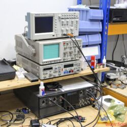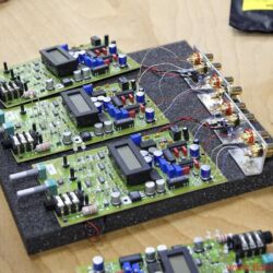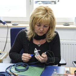 Ein zentral gelegener langer Flur führt im Erdgeschoss von Raum zu Raum und scheint kein Ende nehmen zu wollen. Sachkundig erläutert Robert Suchy das Geschehen, kennt jede Maschine, jeden Handgriff. Das Team lässt sich aber weder durch Chef noch Besucher stören. In einem Raum wird das Einsteigermodell Concept mit Arm und System komplettiert, nebenan lötet jemand an Modulen für die Plattenwaschmaschine Matrix, im größeren Raum gegenüber fräst eine 5-Achsen-CNC-Drehbank hochpräzise 3D-Teile aus Metall. Etwas weiter hinten montieren drei Experten die markanten Innovation-Laufwerke aus Panzerholz und Alu-Elementen, noch zwei Türen weiter fügt ein konzentrierter junger Mann Tellerlager-Elemente zusammen. Dutzende Tonarm-Rohre warten auf die Hochzeit mit passenden Lager-Elementen, Headshells und Lift-Modulen, alles in Griffnähe. Auffällig viele Prüf- und Messinstrumente stehen überall parat, Hochleistungskleber, Reinigungs- und Schmiermittel sowieso. Witziges Kontrastprogramm: Irgendwo dudelt ein Radio aus DIY-Pappwürfeln unter der Decke.