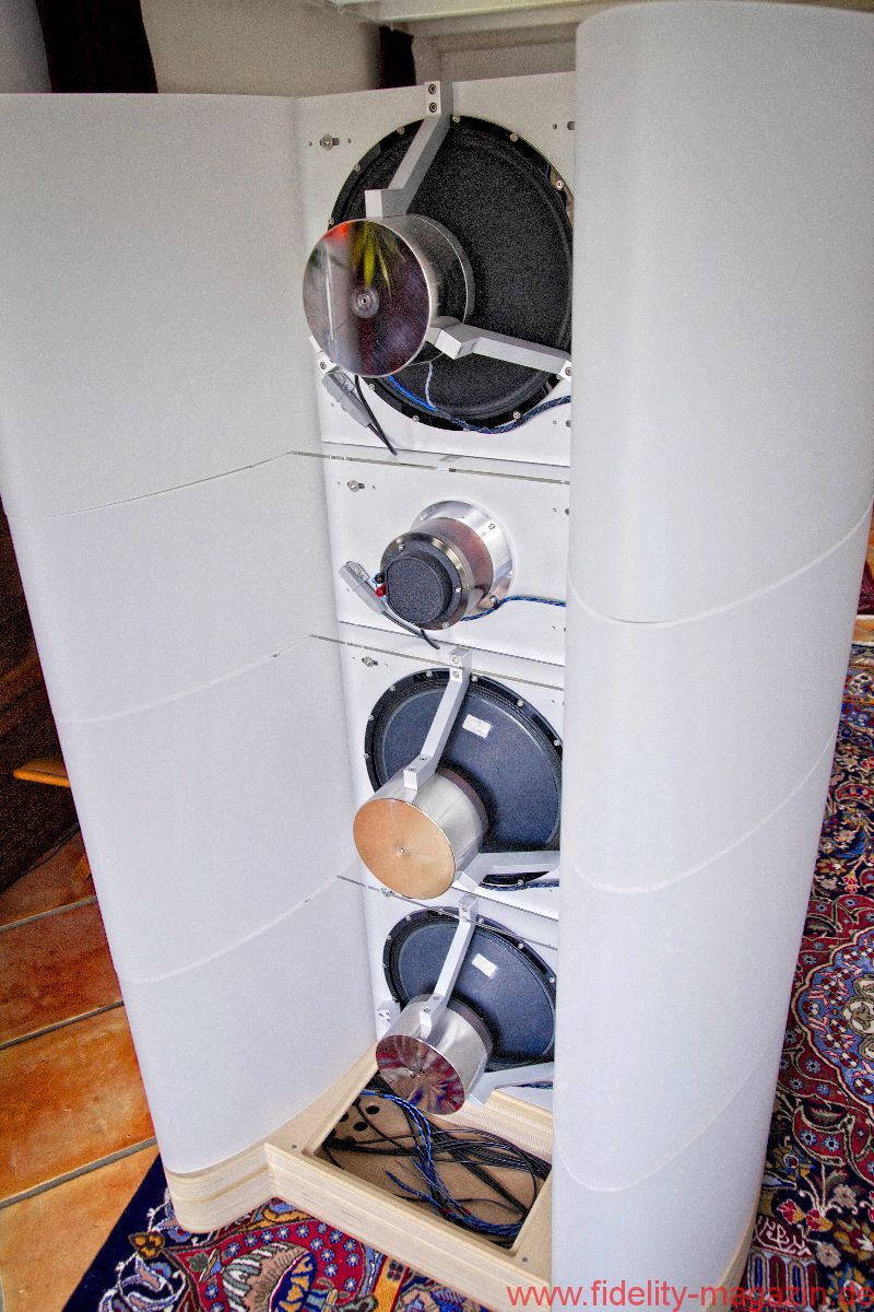 Wenn nun von Langas Verdienst einzig aus einem überzeugenden Messeauftritt bestanden hätte, wäre das zwar lobens-, aber nicht weiter berichtenswert. Aber da ist mehr. Der Mann baut nicht einfach wie hunderte Anderer Lautsprecher, in dem Sinne, dass er serienmäßige oder nach Wunsch modifizierte Chassis in selbst entworfene Gehäuse schraubt – er baut vielmehr wirklich eigene Lautsprecher, also Tief-, Mittel- und Hochtonchassis, die dann in erster Linie einzeln zum Verkauf angeboten werden, aber auch in eigenen Schallwandlerkreationen Verwendung finden. Mittlerweile ist da eine beeindruckende Liste zusammengekommen, von Tieftönern aller Kaliber über Adaptionen historischer Breitbänder und Koaxial-Chassis bis zu Druckkammertreibern für Hochtonhörner.